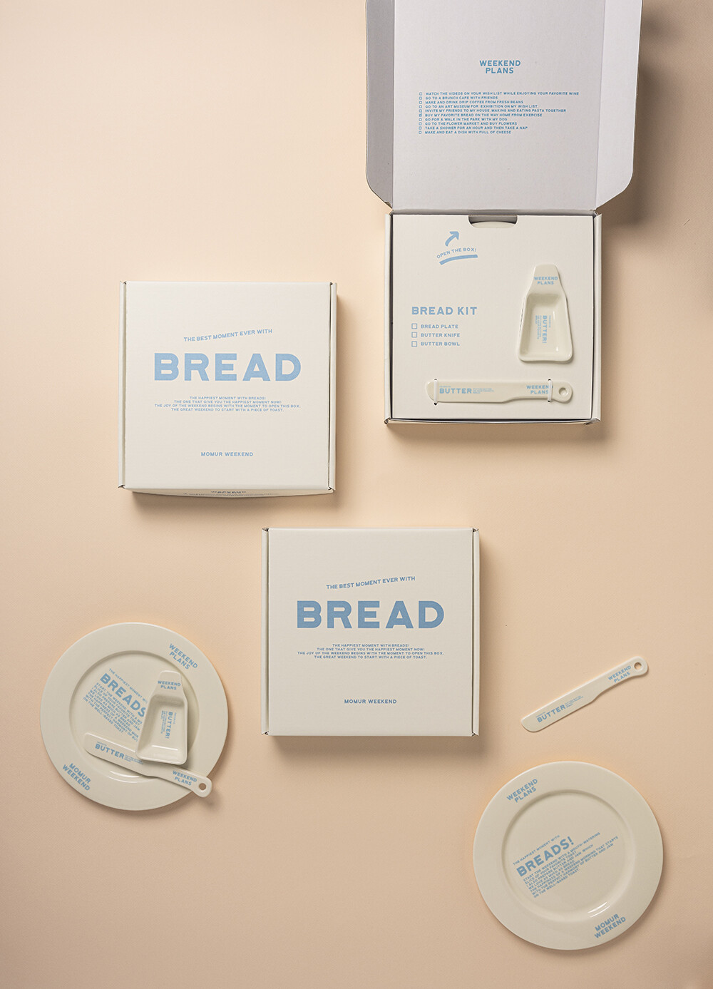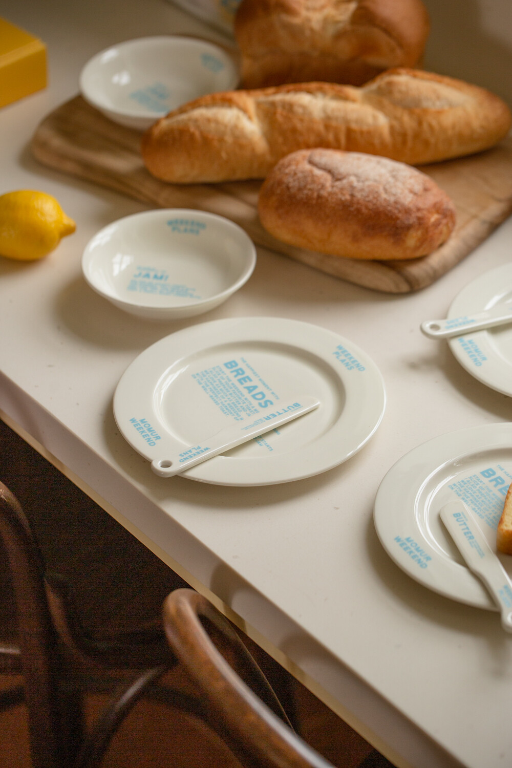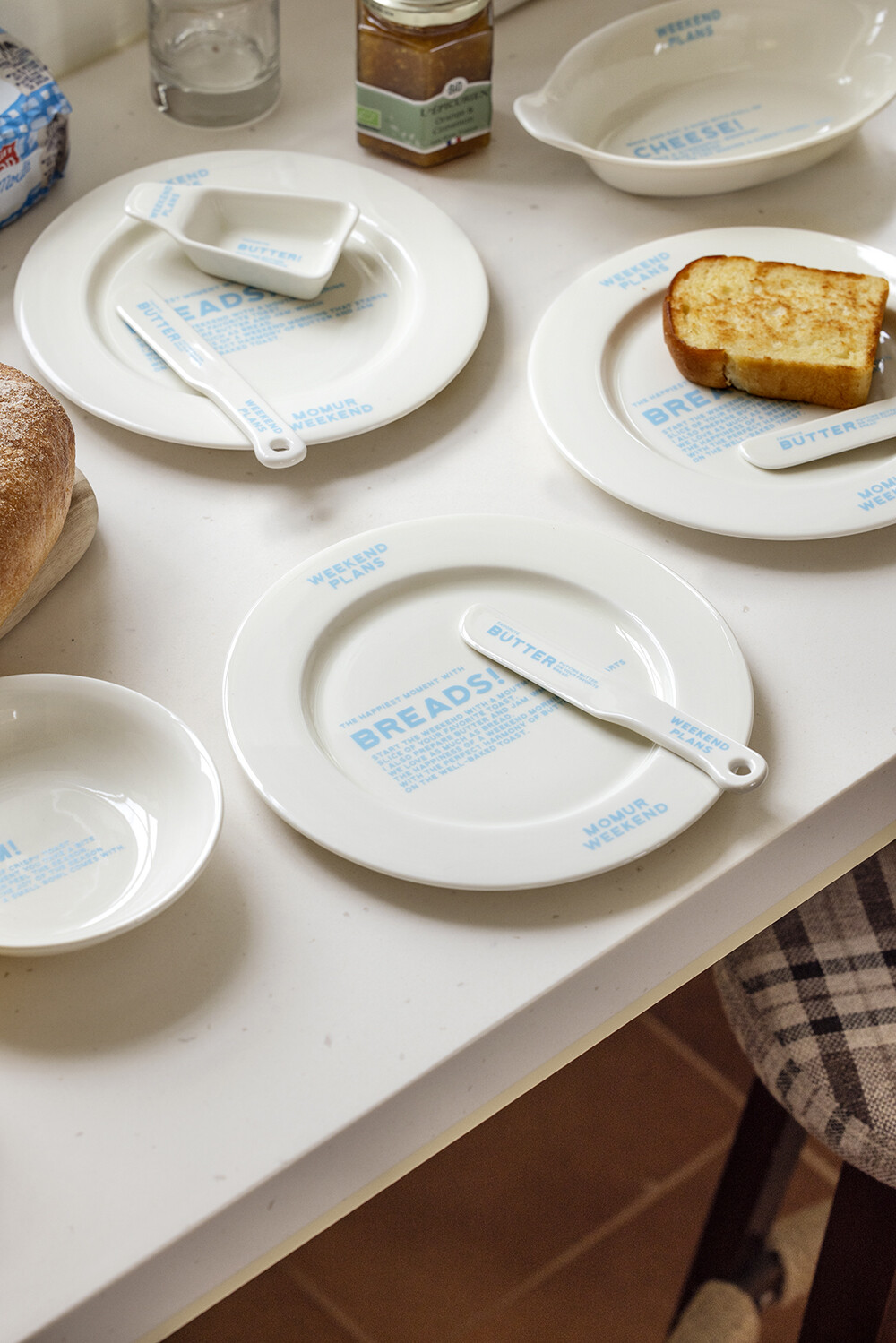 토스트, 샌드위치, 식사빵 등 빵을 플레이팅 하기 좋은 기본 원형 타입의 도자기와 버터 나이프, 버터볼이 세트로 구성된 기프트 상품입니다. 빵을 좋아하는 나에게, 그리고 친구에게 선물해 보세요. 아이보리 컬러는 밝은 톤의 스카이블루 그래픽 요소가 반영된 컬러입니다.