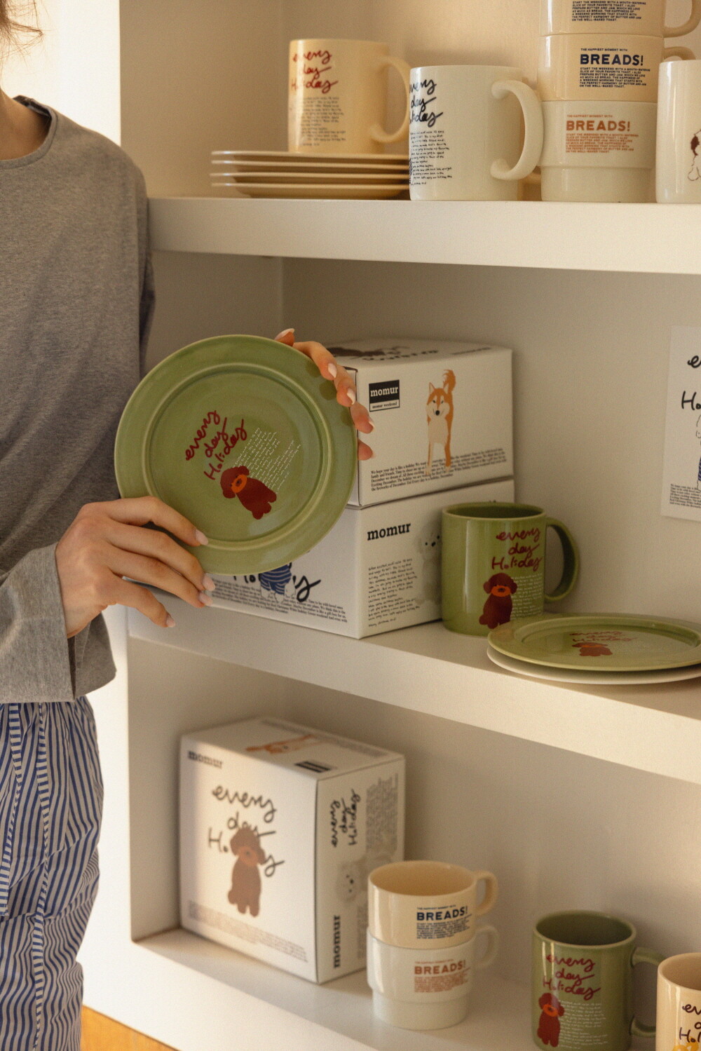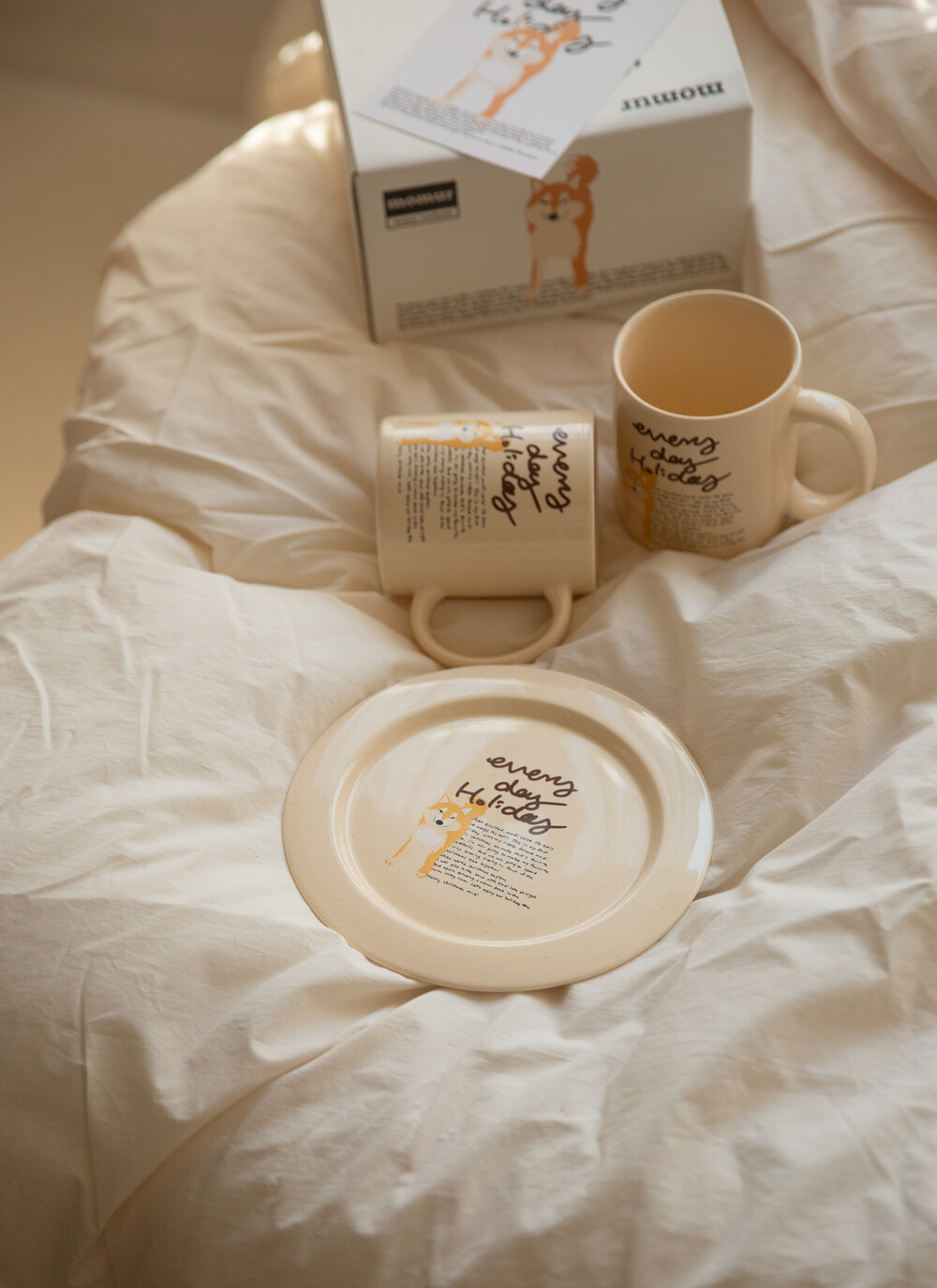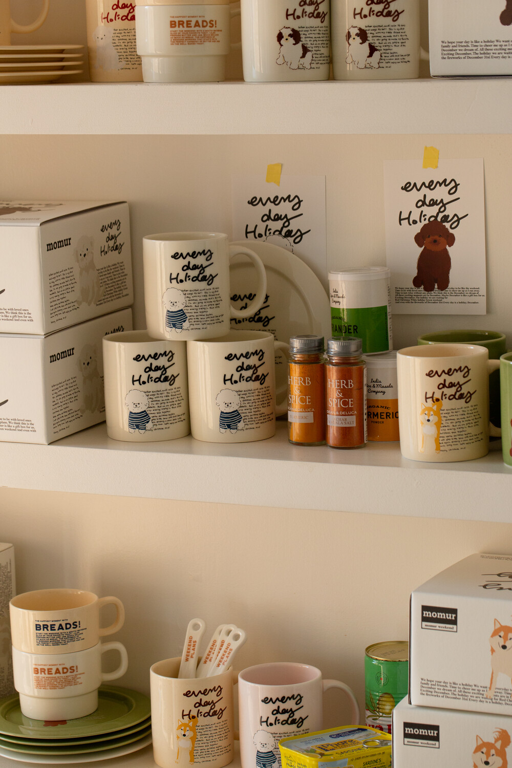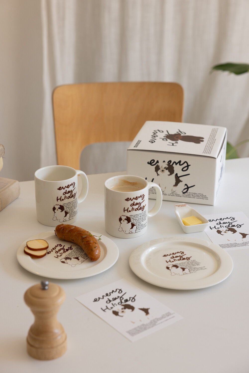 모머위켄드 홀리데이 메인 테마인 ‘에브리데이 홀리데이’ 레터링과 귀여운 강아지 그림이 들어간 도자기 제품입니다.