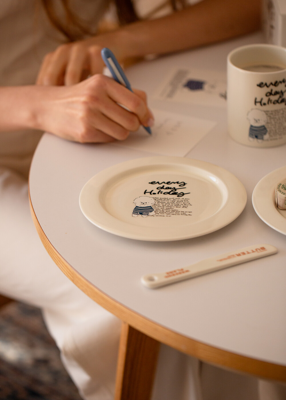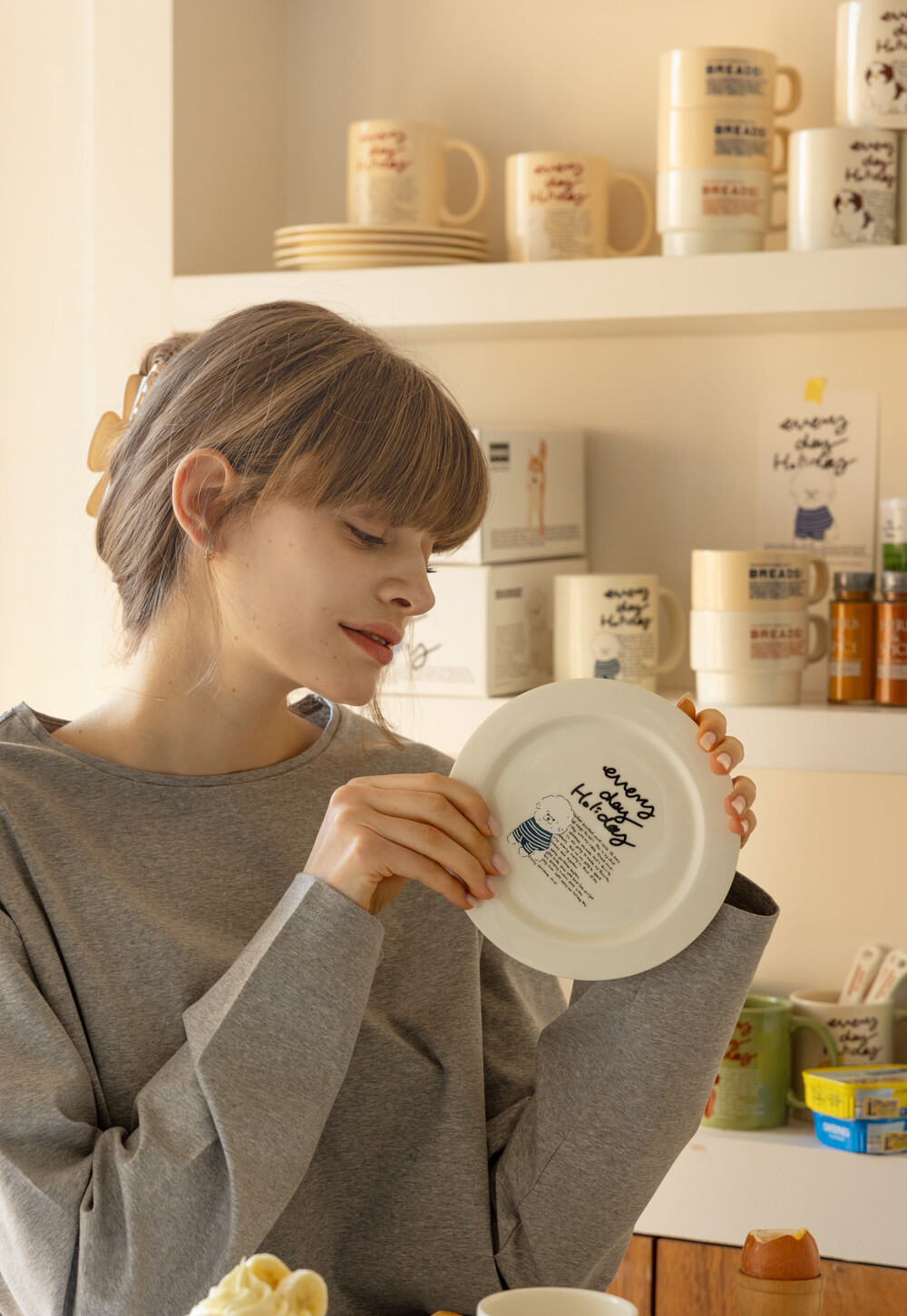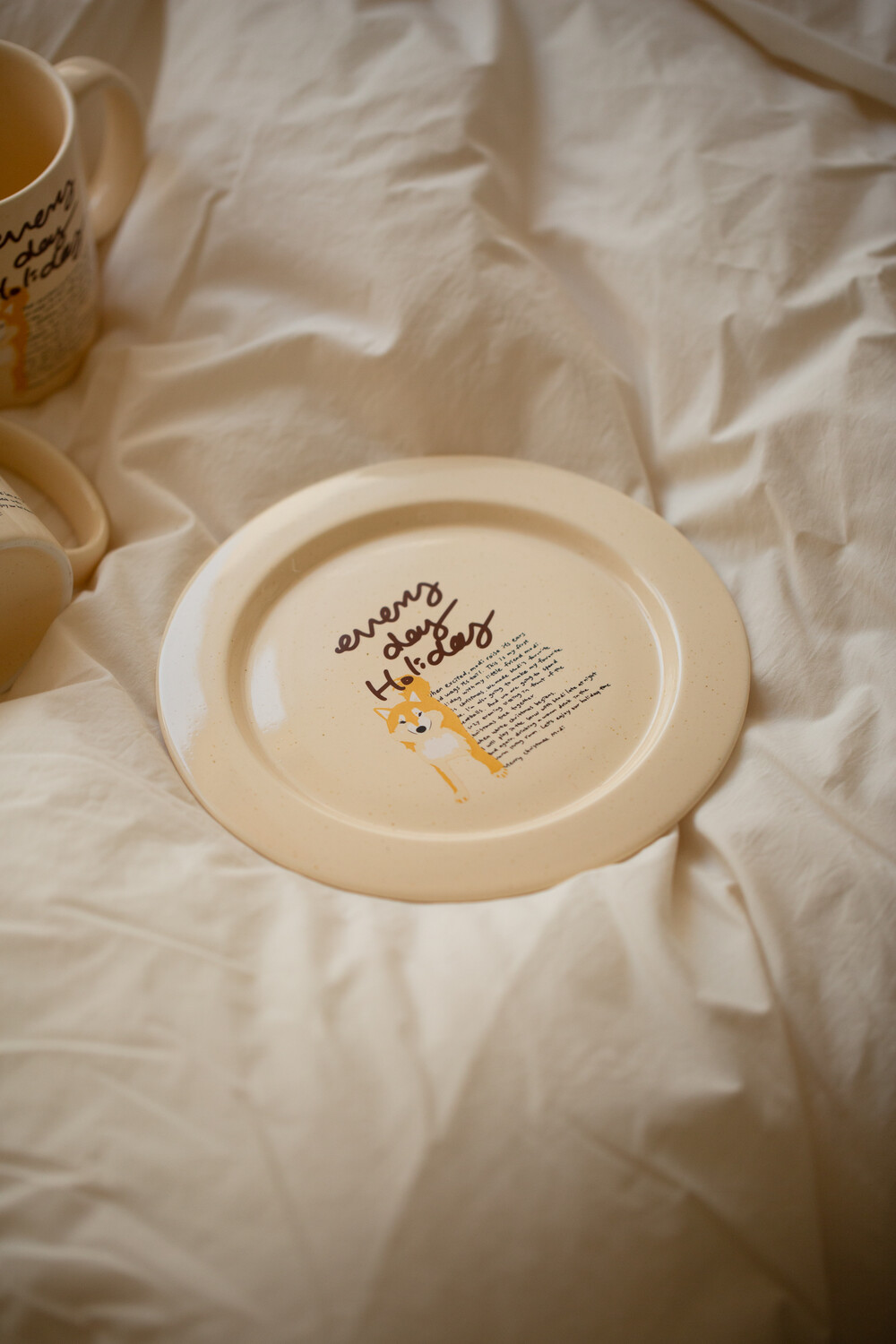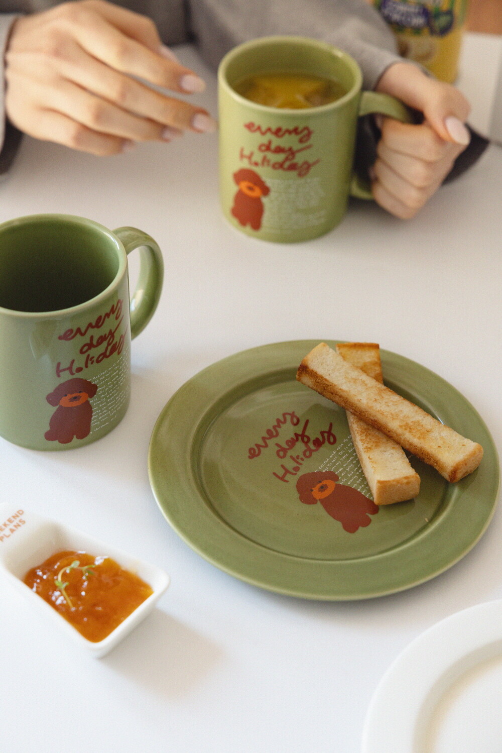 모머위켄드 홀리데이 메인 테마인 ‘에브리데이 홀리데이’ 레터링과 귀여운 강아지 그림이 들어간 도자기 제품입니다.