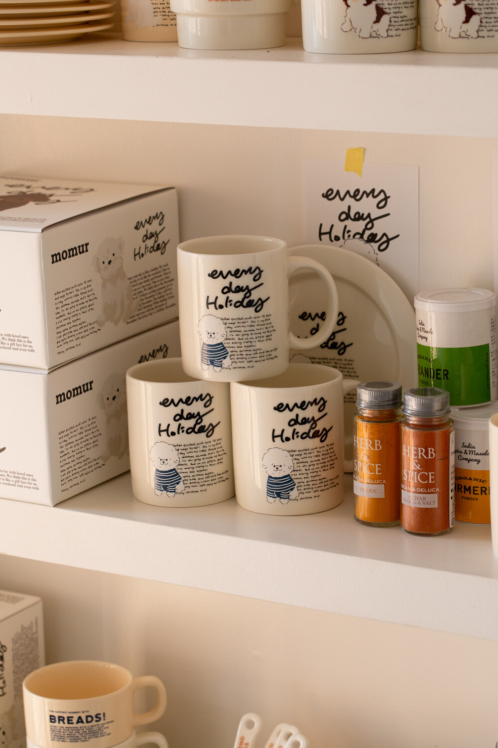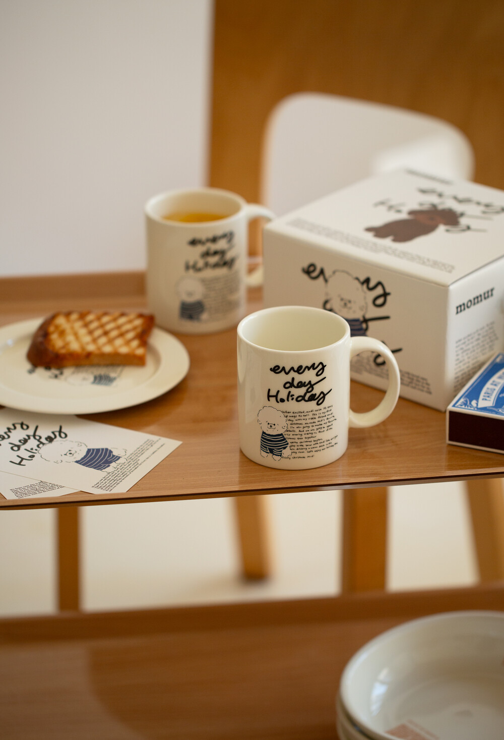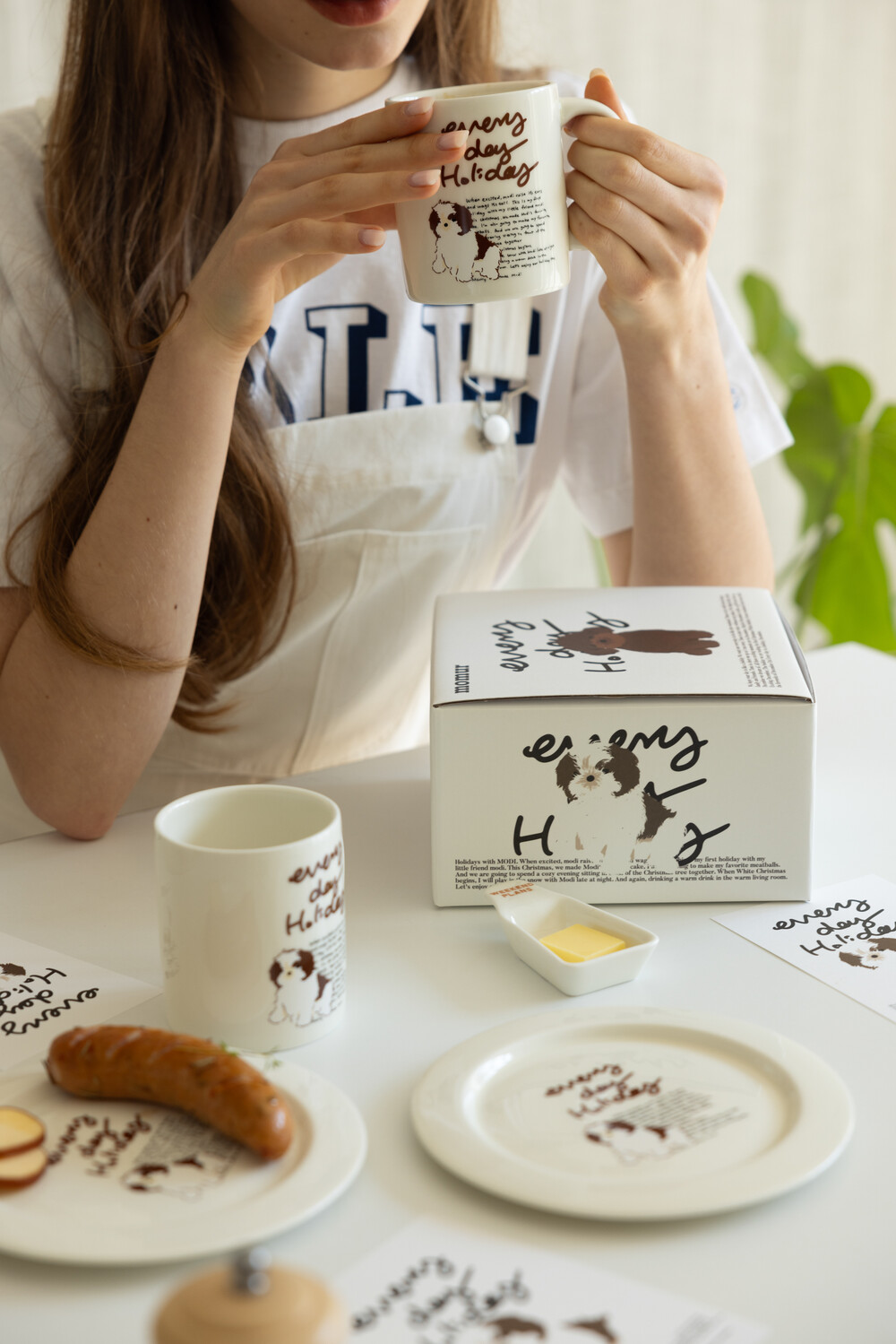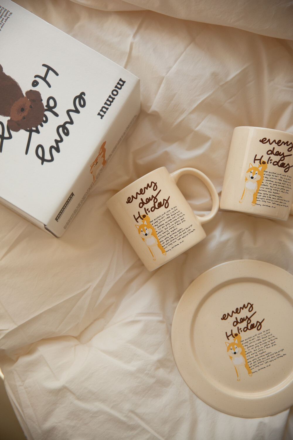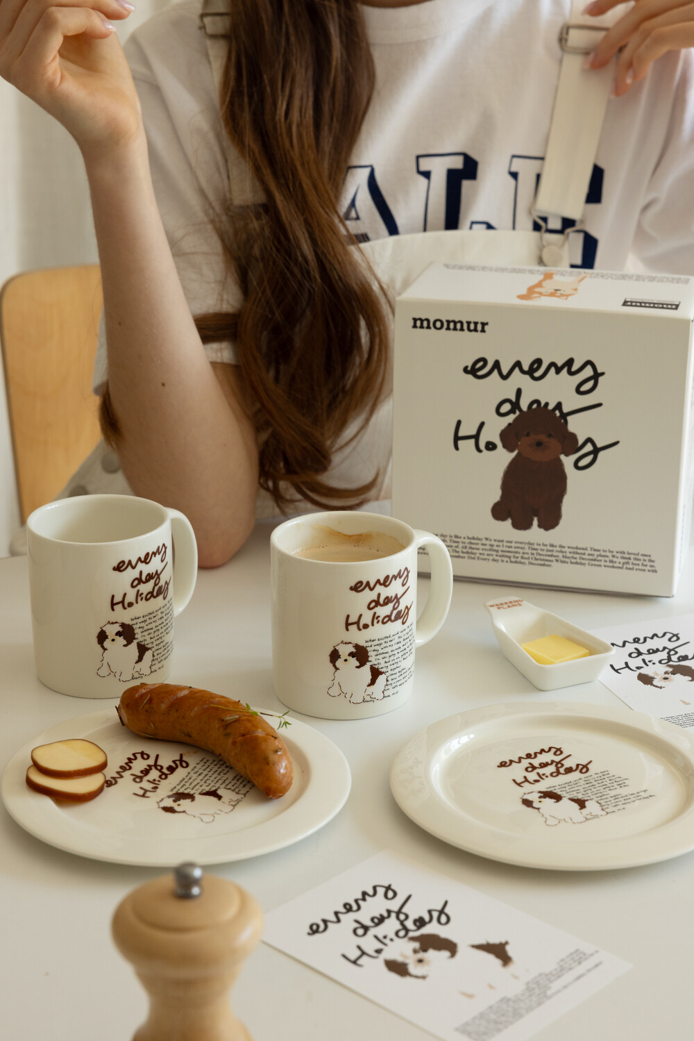 모머위켄드 홀리데이 메인 테마인 ‘에브리데이 홀리데이’ 레터링과 귀여운 강아지 그림이 들어간 도자기 제품입니다.