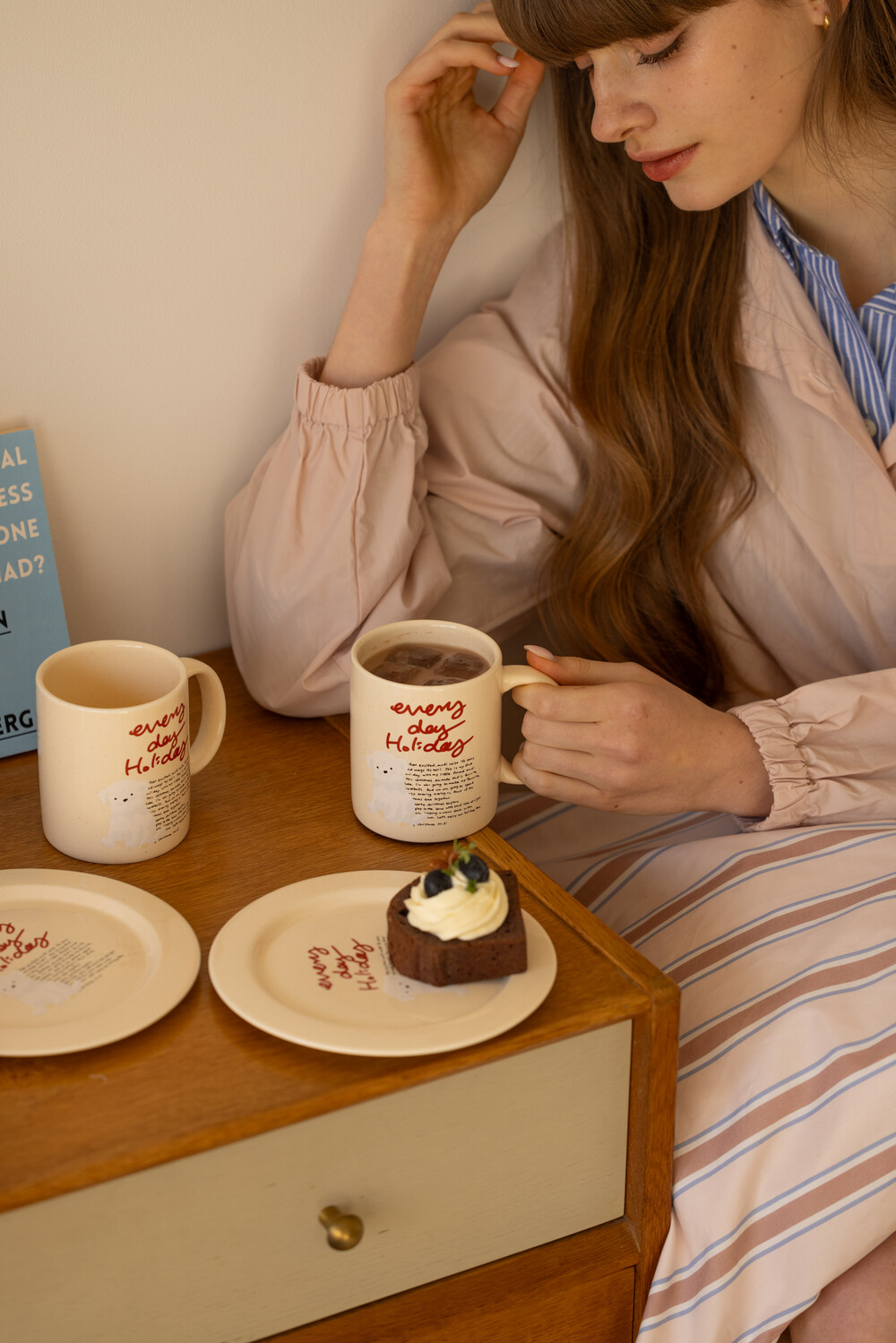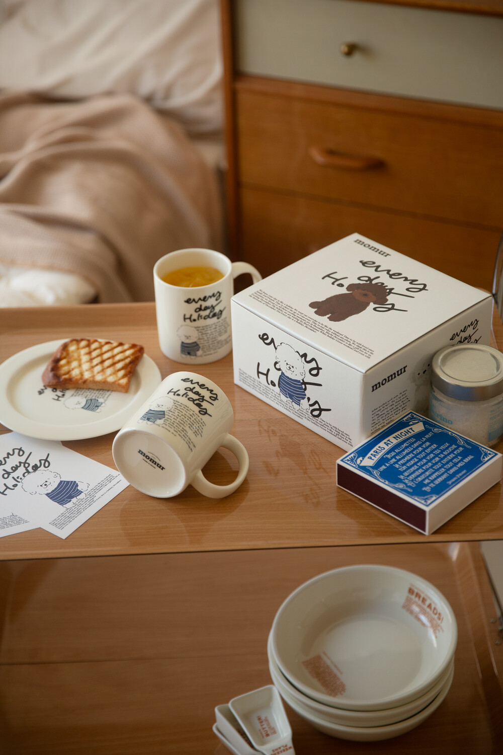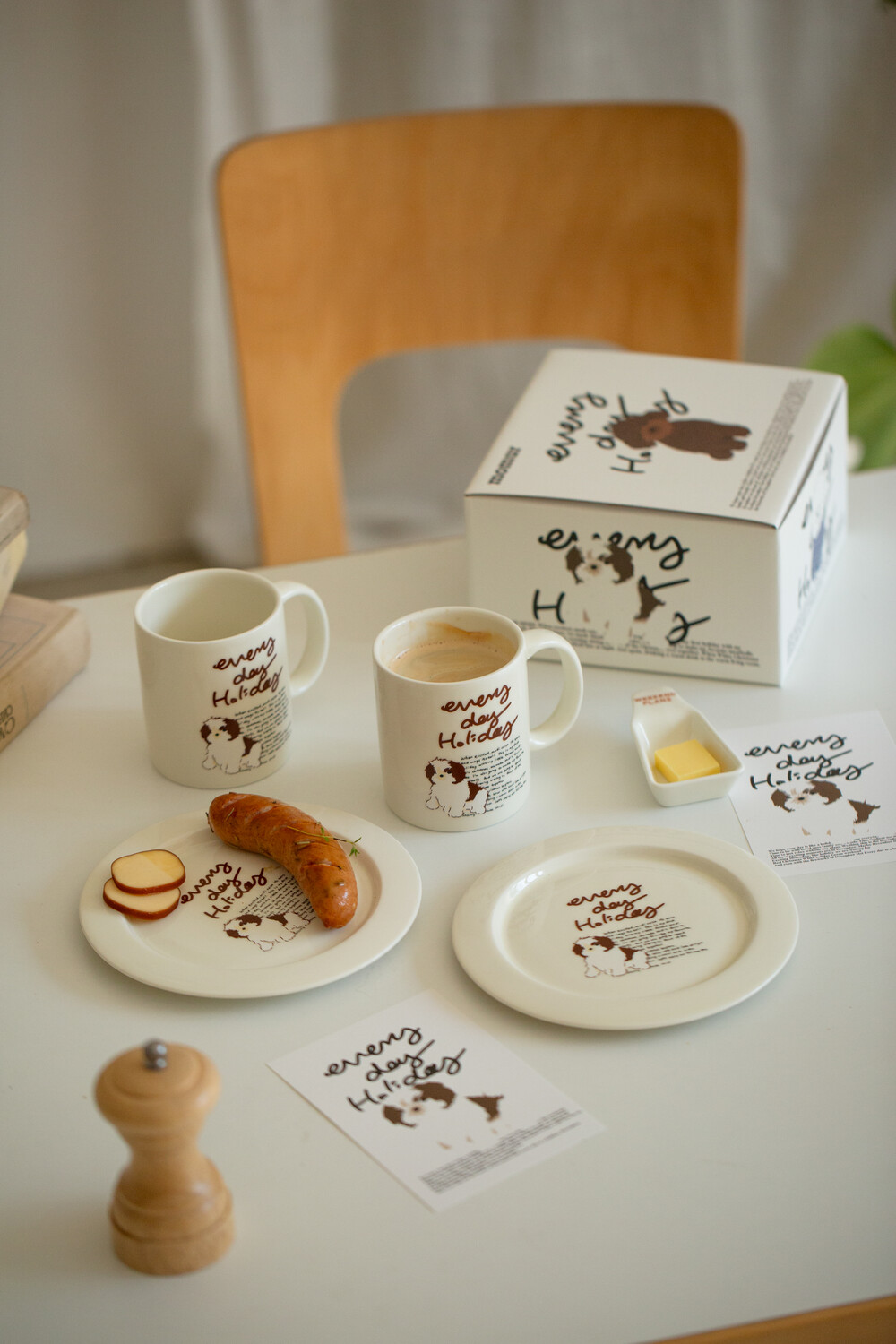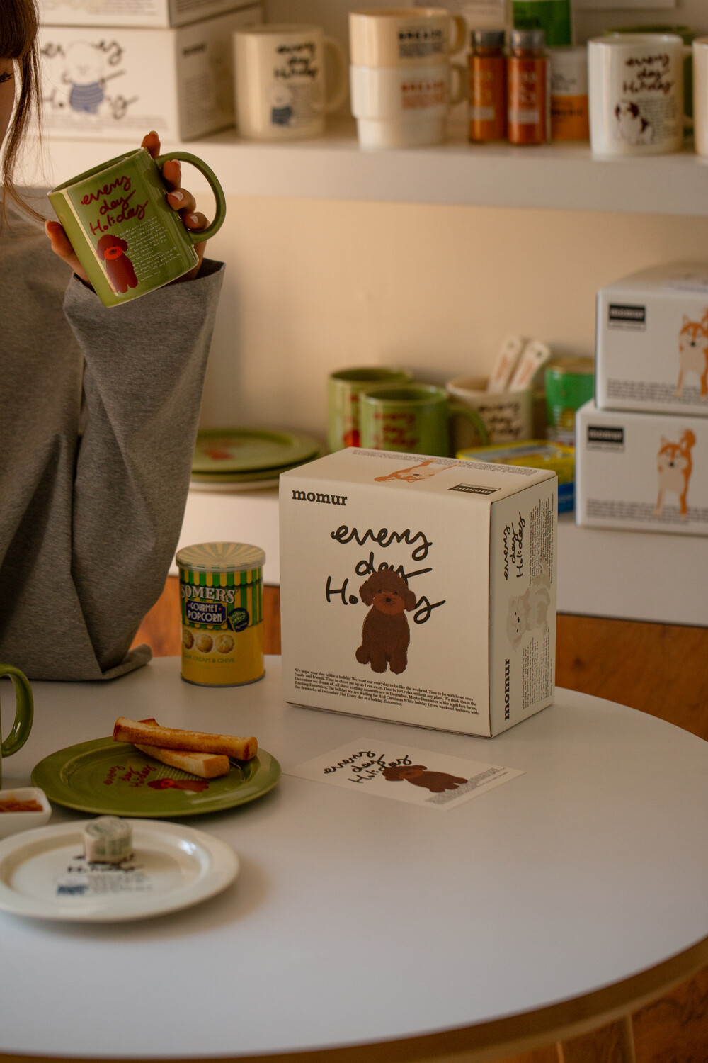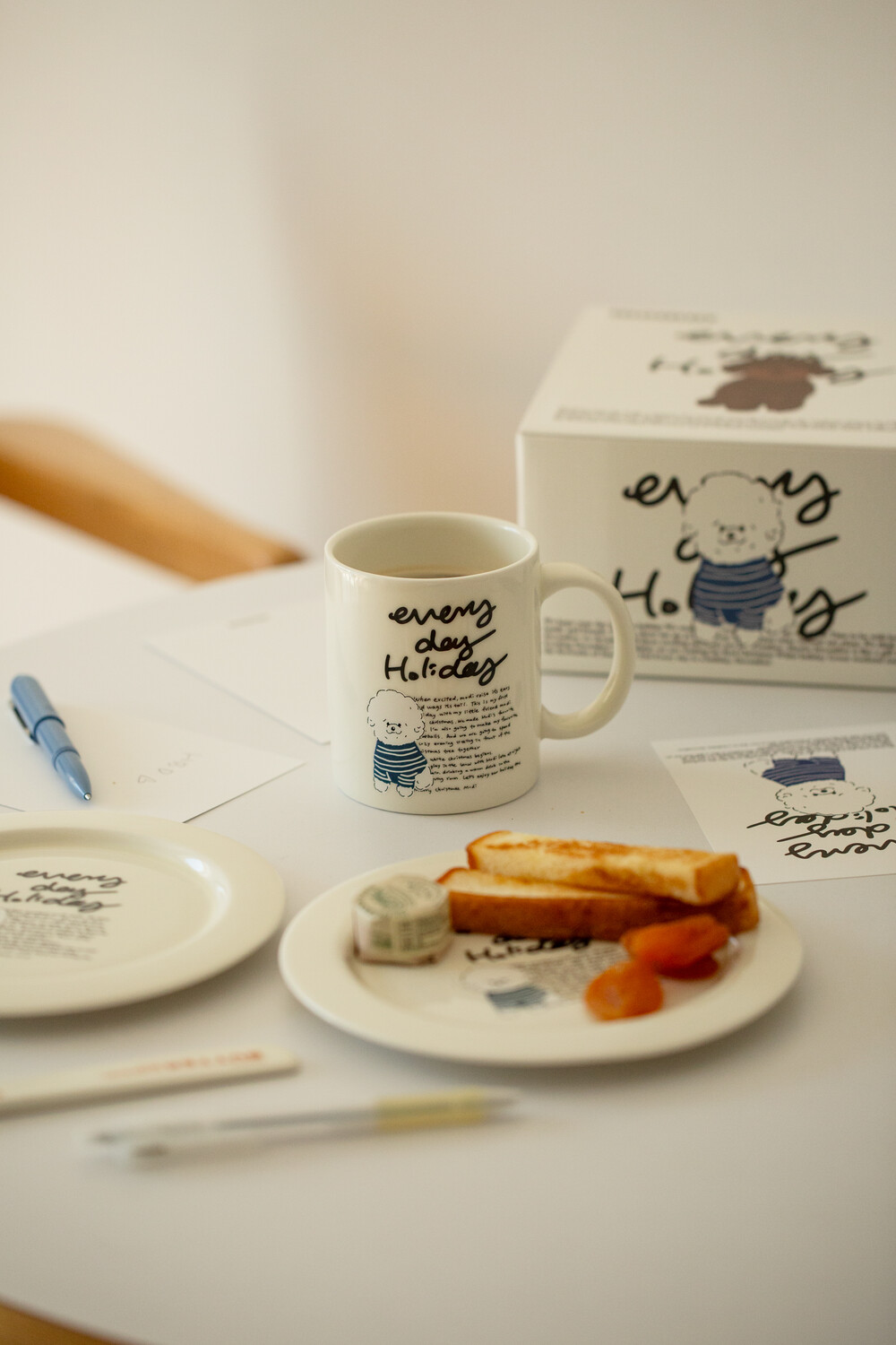 모머위켄드 홀리데이 메인 테마인 ‘에브리데이 홀리데이’ 레터링과 귀여운 강아지 그림이 들어간 도자기 제품입니다.