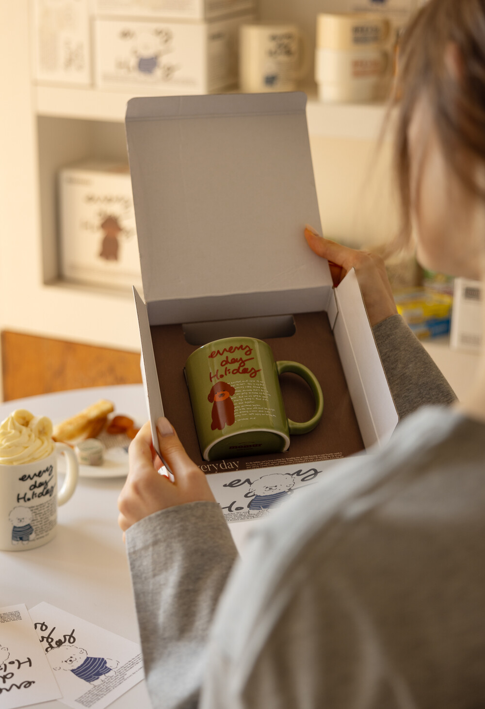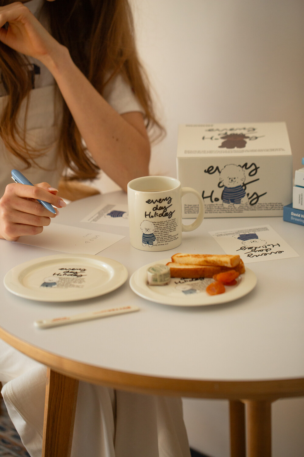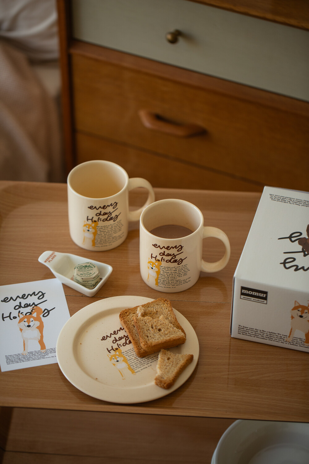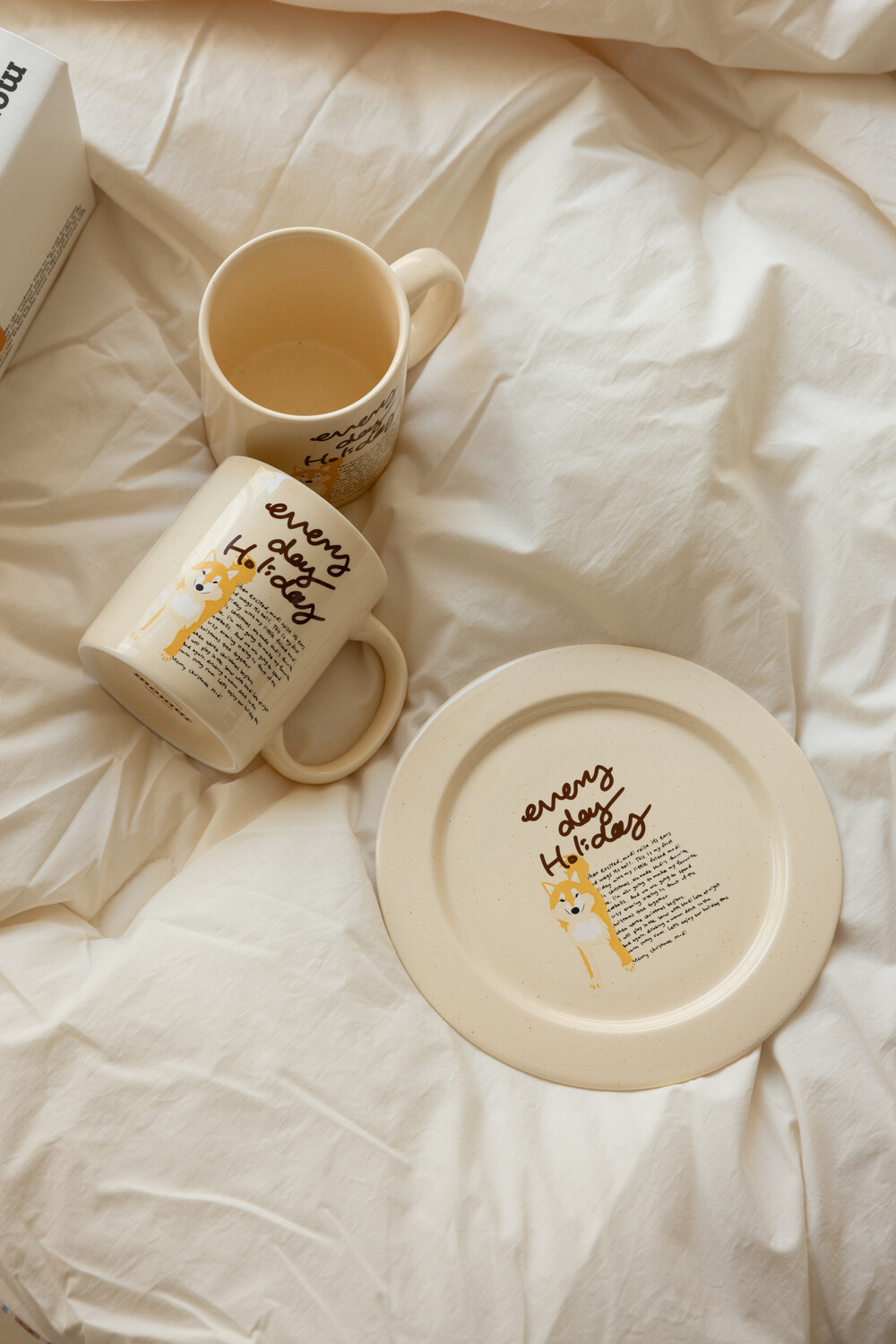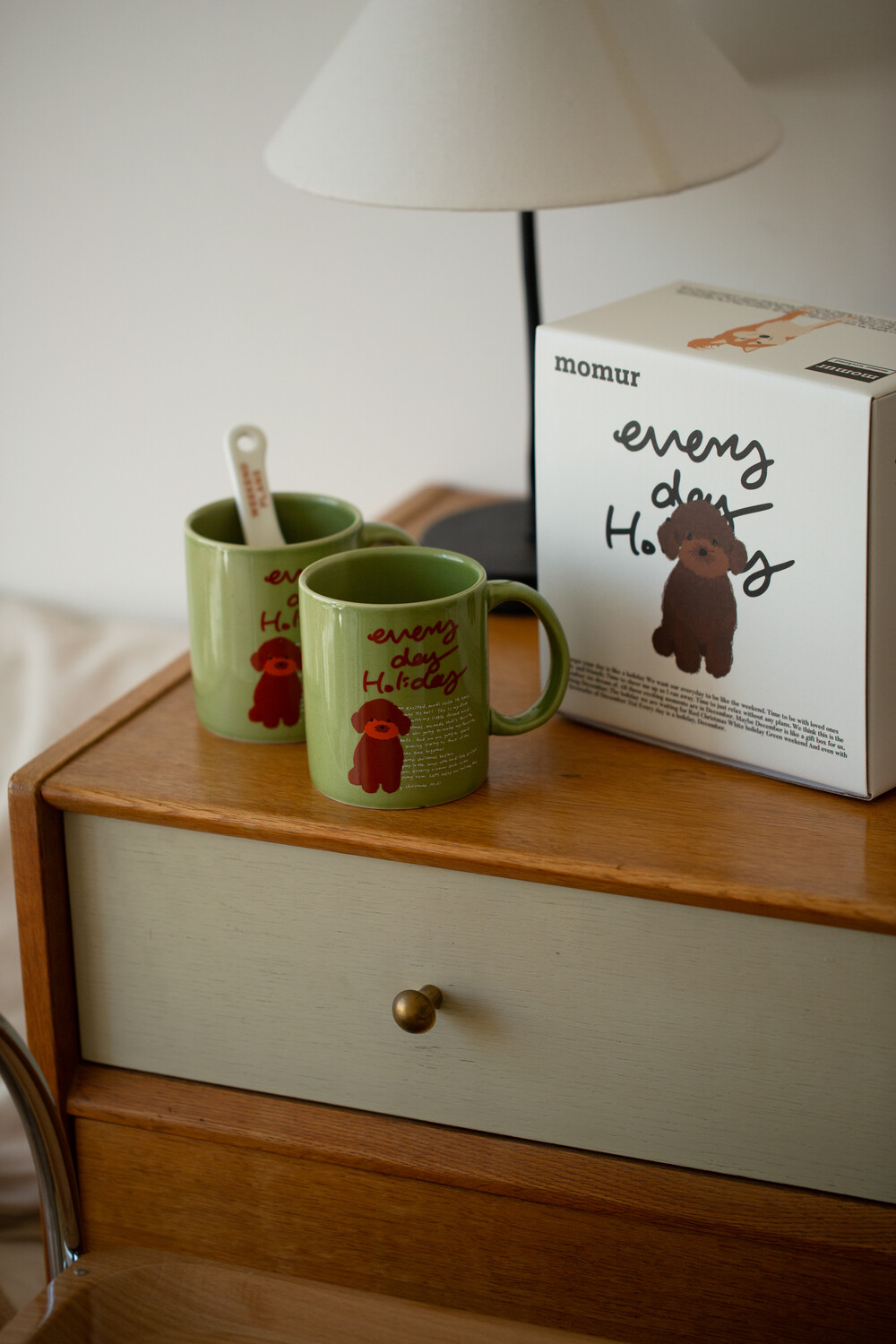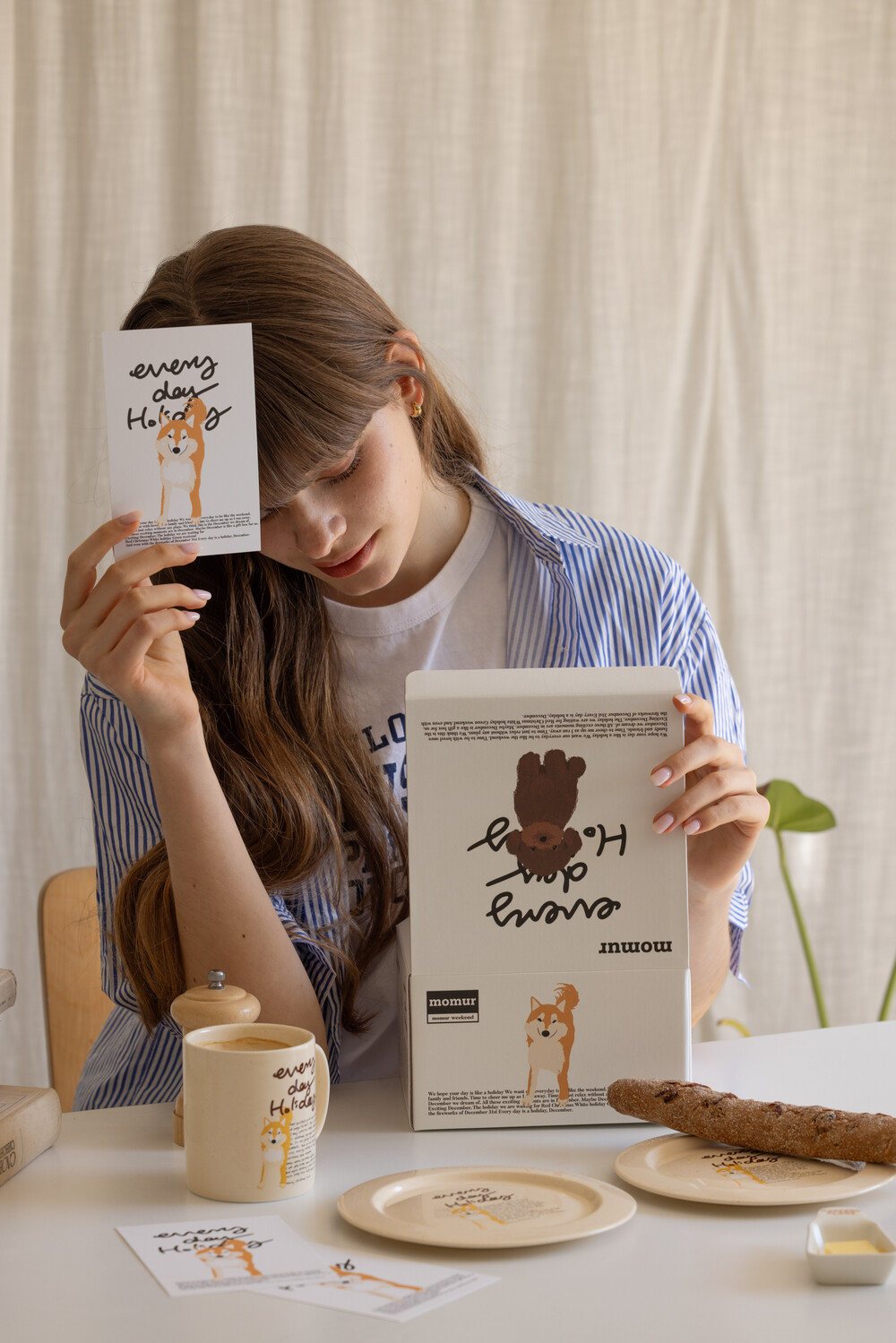 모머위켄드 홀리데이 메인 테마인 ‘에브리데이 홀리데이’ 레터링과 귀여운 강아지 그림이 들어간 도자기 제품입니다.