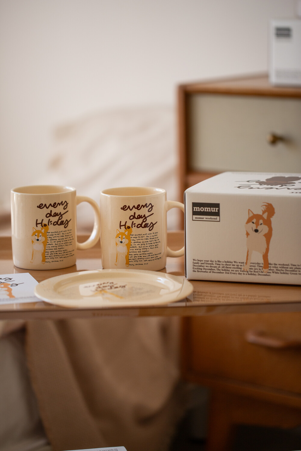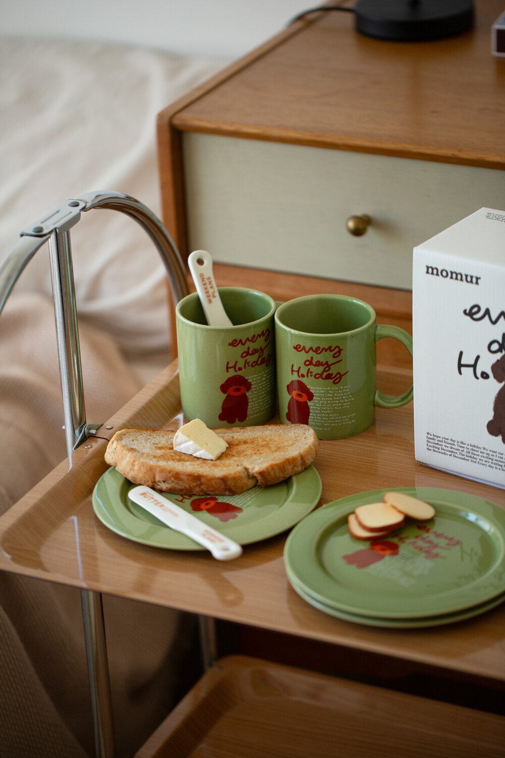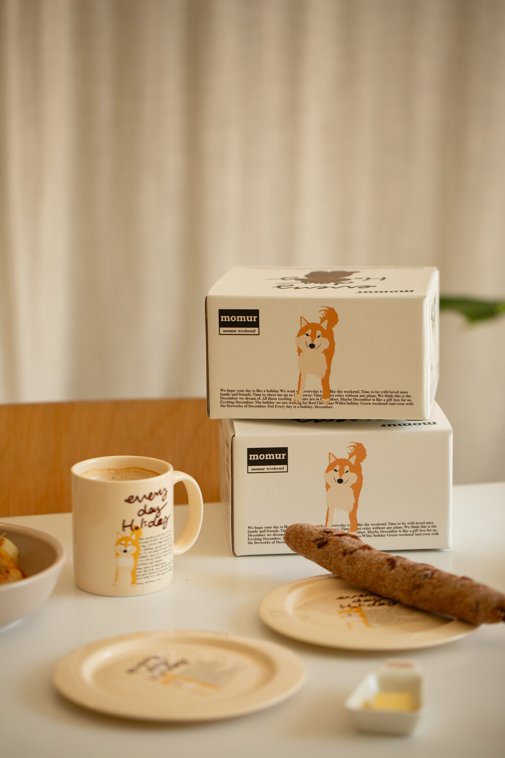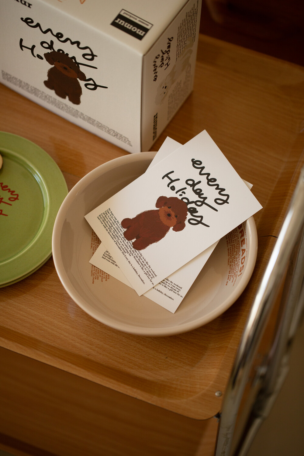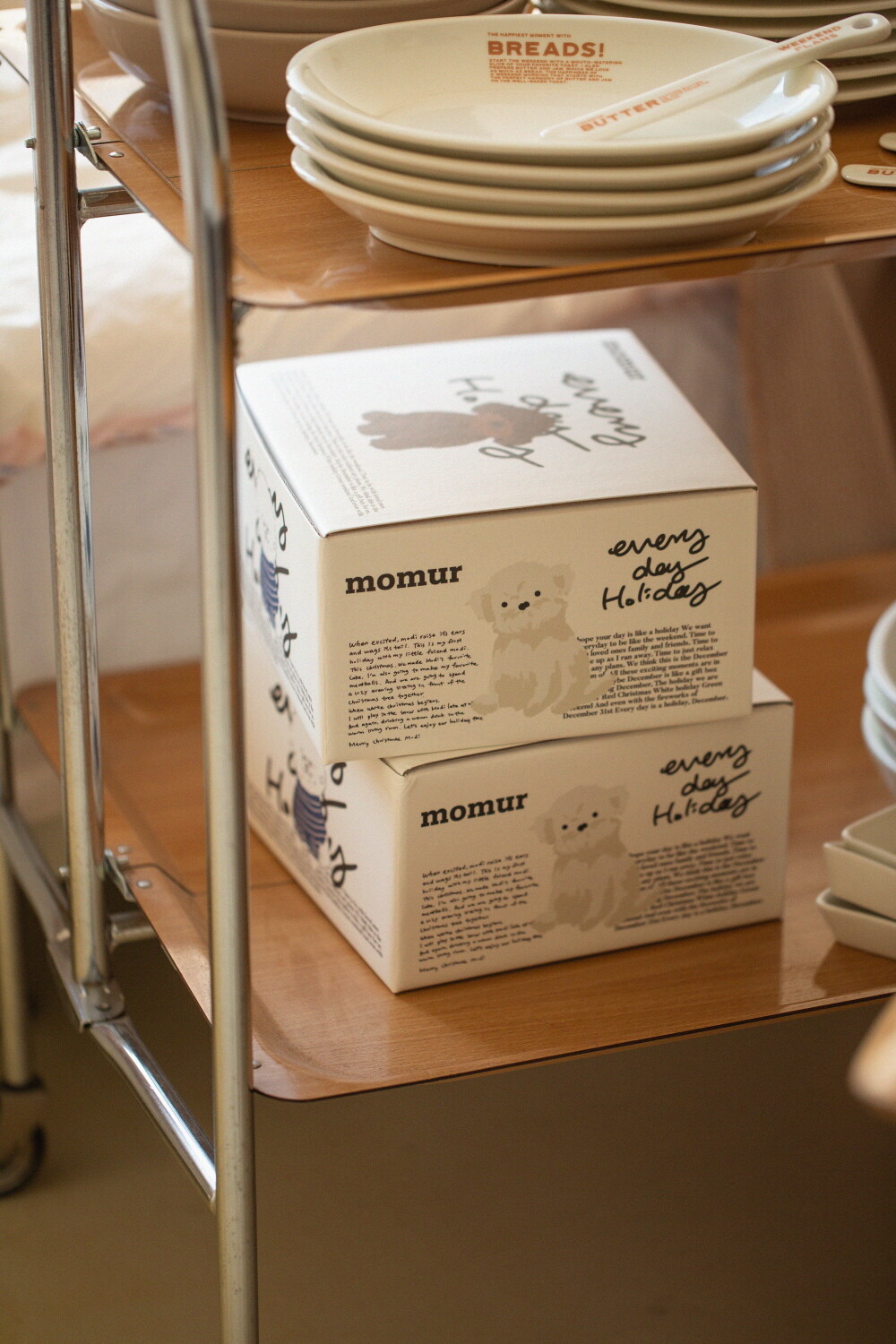 모머위켄드 홀리데이 메인 테마인 ‘에브리데이 홀리데이’ 레터링과 귀여운 강아지 그림이 들어간 도자기 제품입니다.