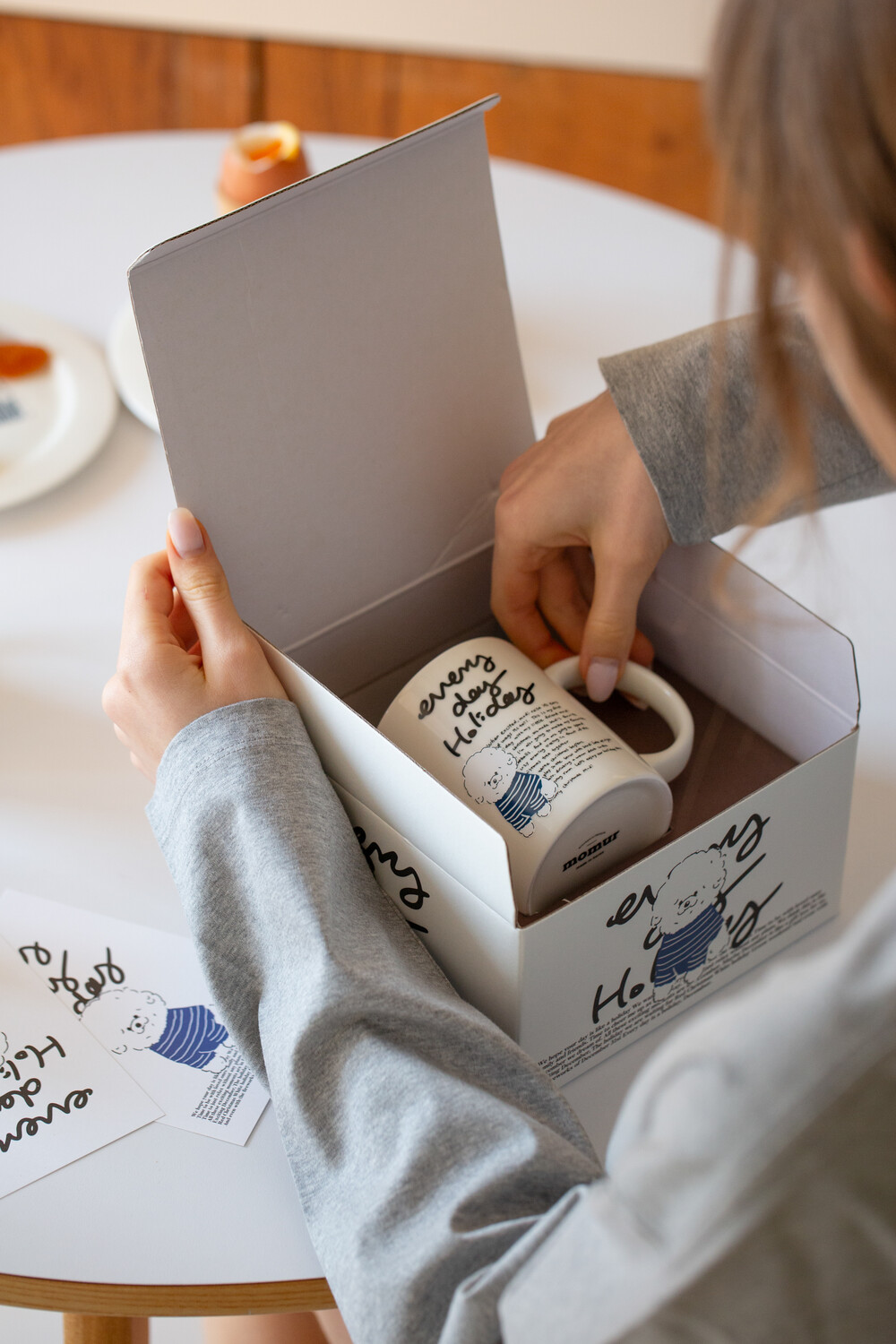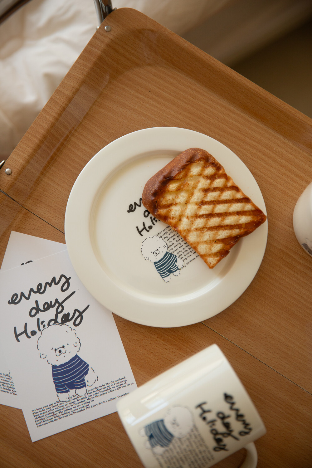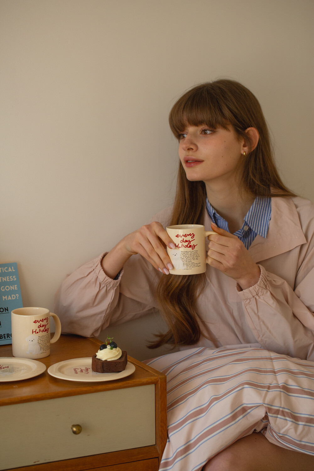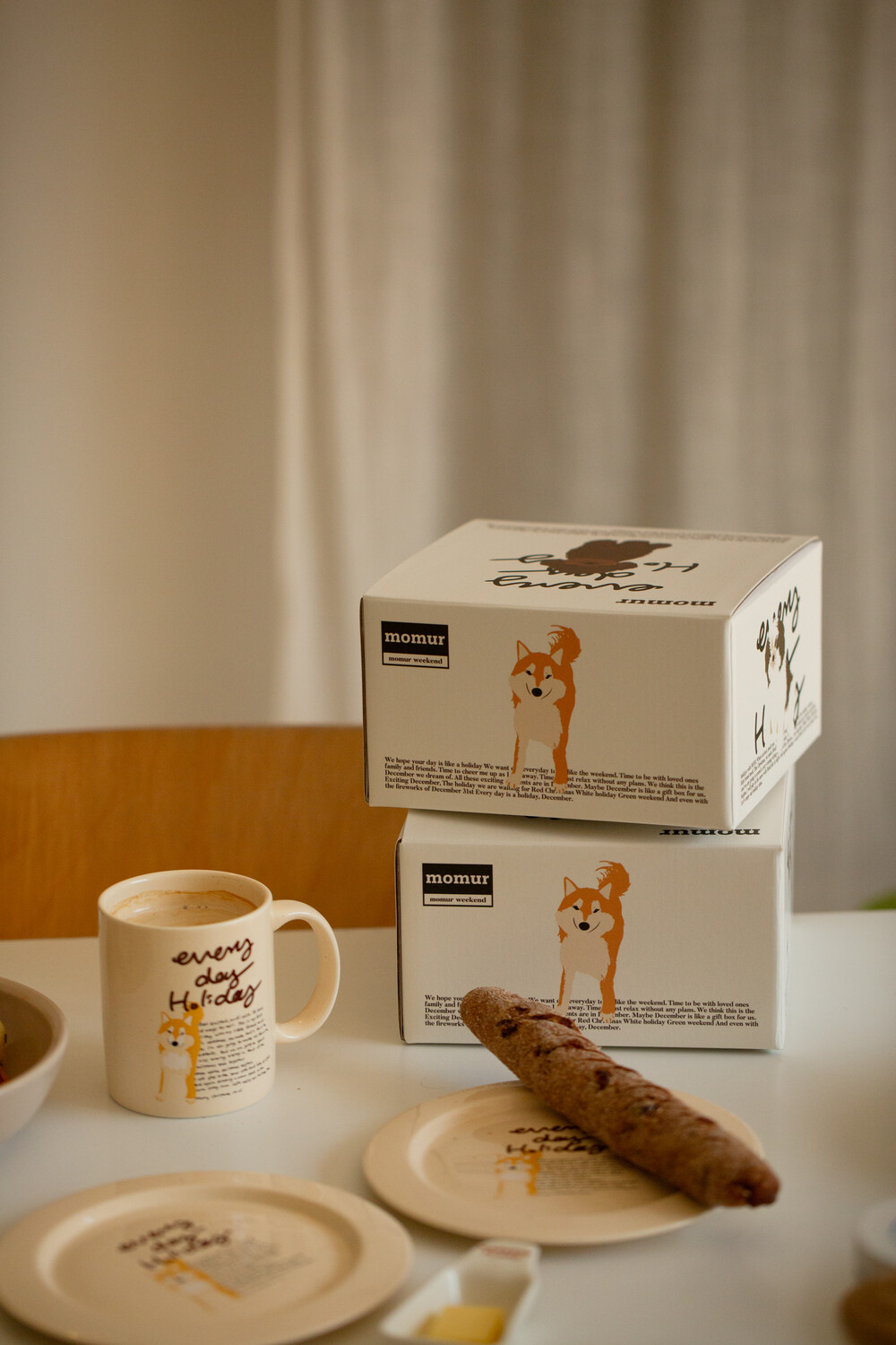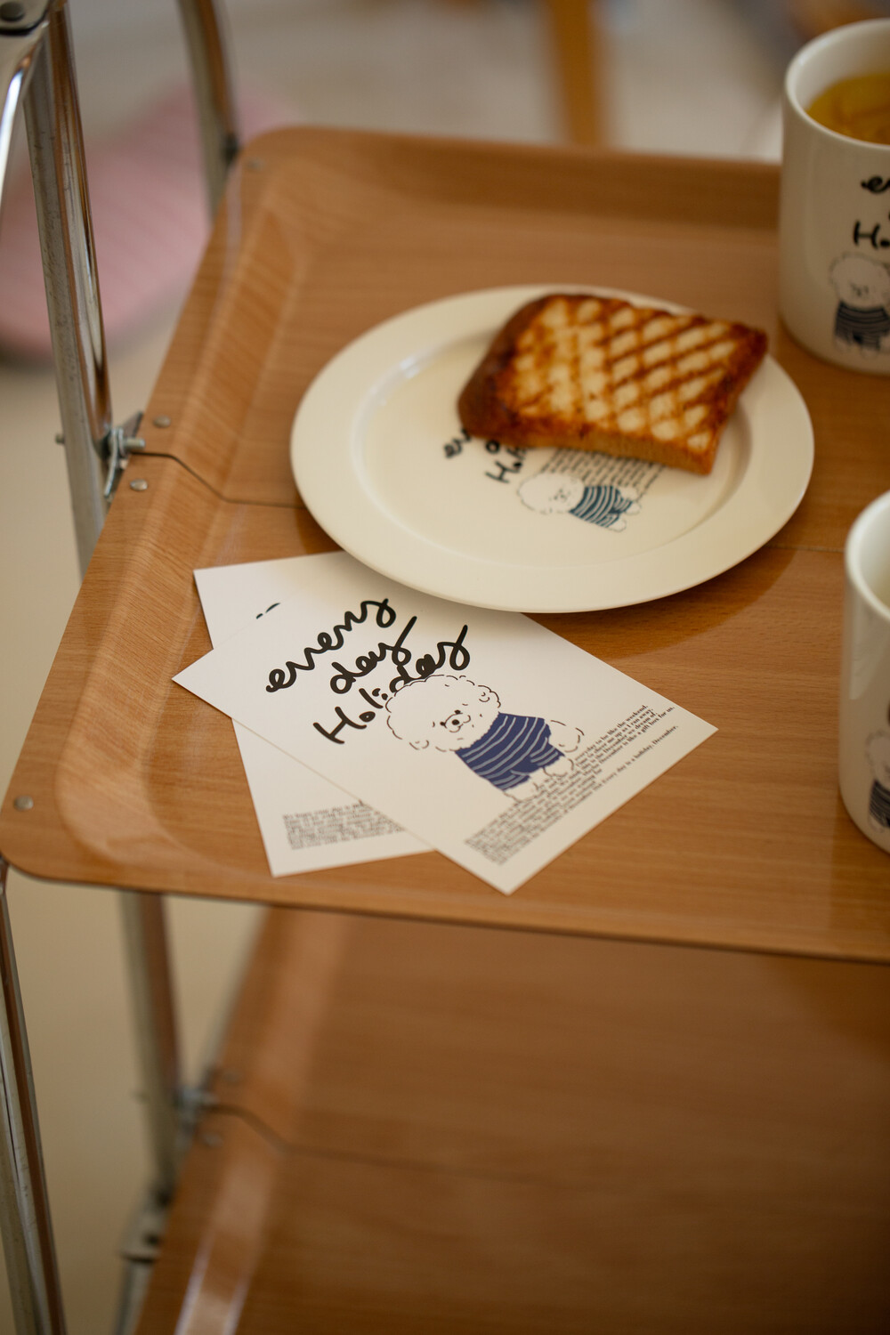 모머위켄드 홀리데이 메인 테마인 ‘에브리데이 홀리데이’ 레터링과 귀여운 강아지 그림이 들어간 도자기 제품입니다.