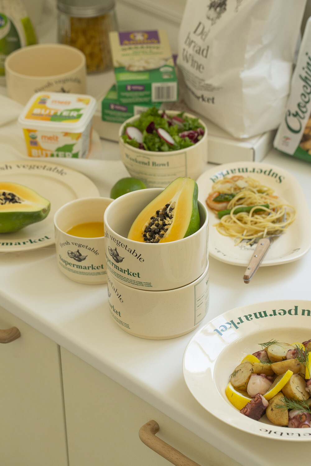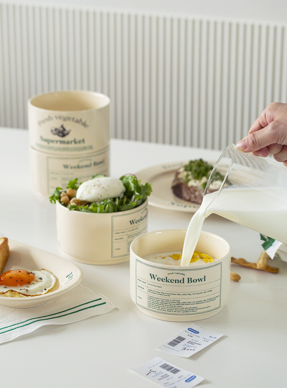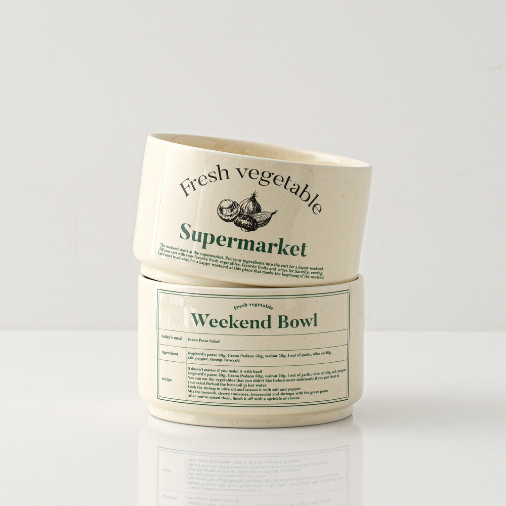 샐러드, 씨리얼, 요거트, 포케 등 다양한 음식을 담을 수 있는 실용적인 디자인의 볼입니다. 그릇 앞면에는 슈퍼마켓 라인의 메인 그래픽이 반영되어 있으며, 뒷면에는 위켄드볼 레시피가 반영되어 있습니다. 주말 나를 위한 한그릇의 건강을 채워 보세요.
