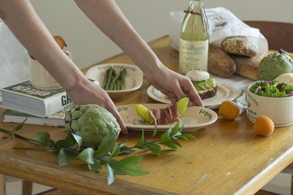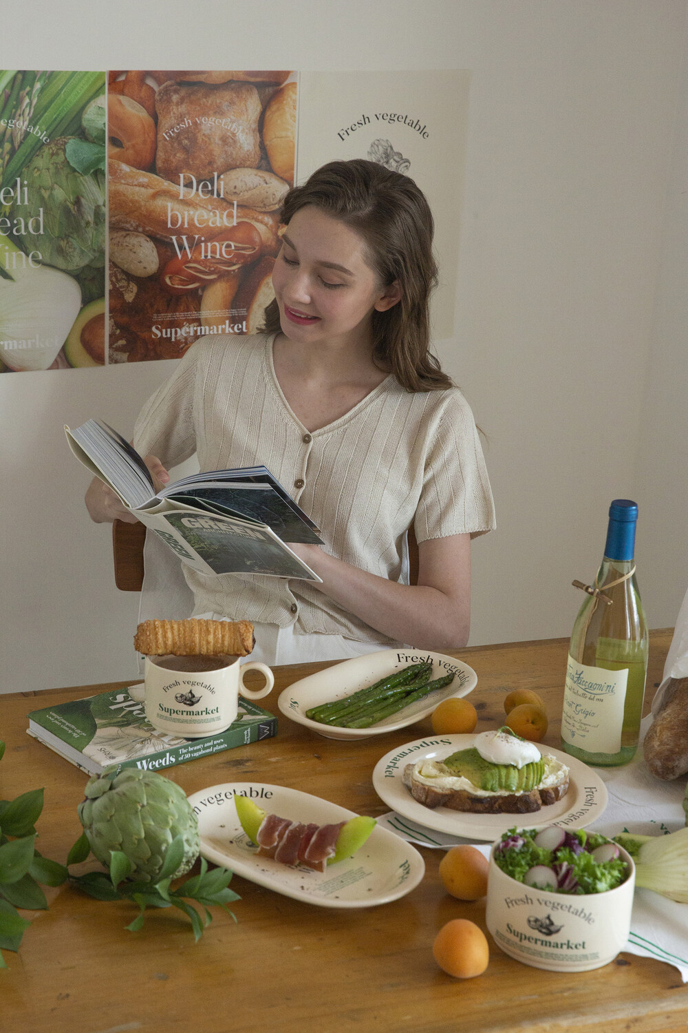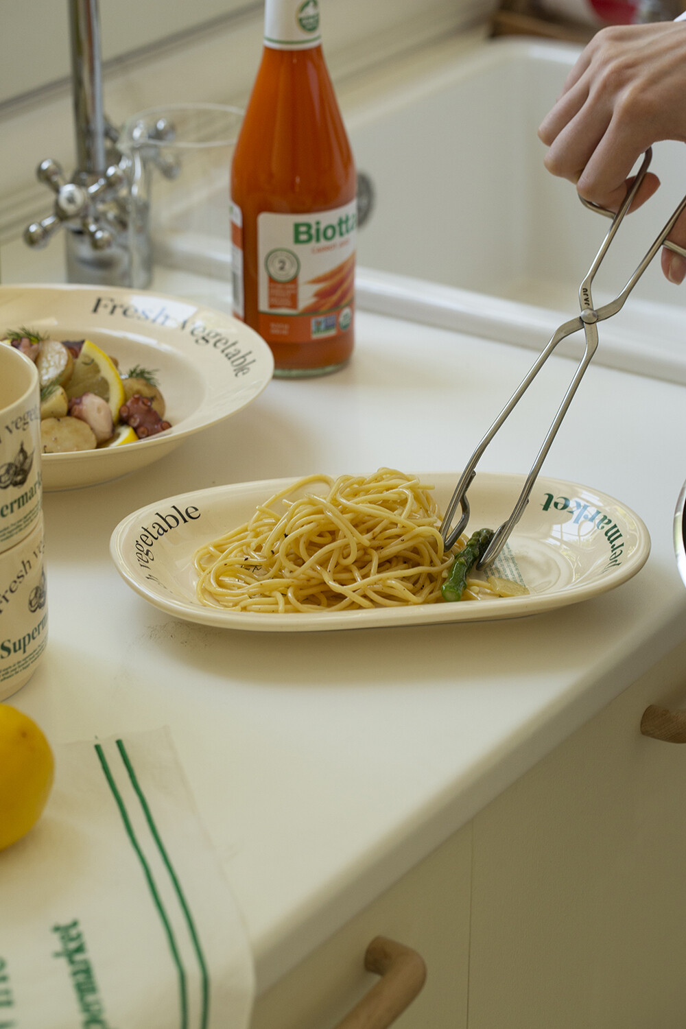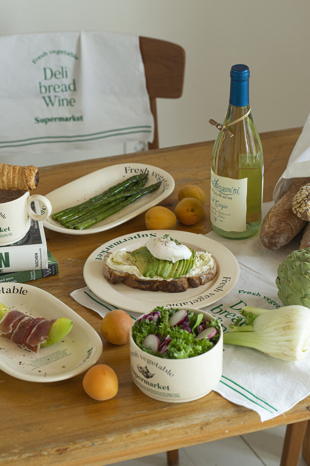토스트, 샐러드 등 다양한 음식을 담을 수 있는 오발 타입의 도자기입니다. 1인 브런치 플레이트로 사용하기 좋은 사이즈로, 선물용으로도 추천하는 제품입니다. 버터 컬러는 은은한 점이 들어간 버터 컬러 유약에 블랙과 그린 그래픽 요소가 반영된 컬러입니다.