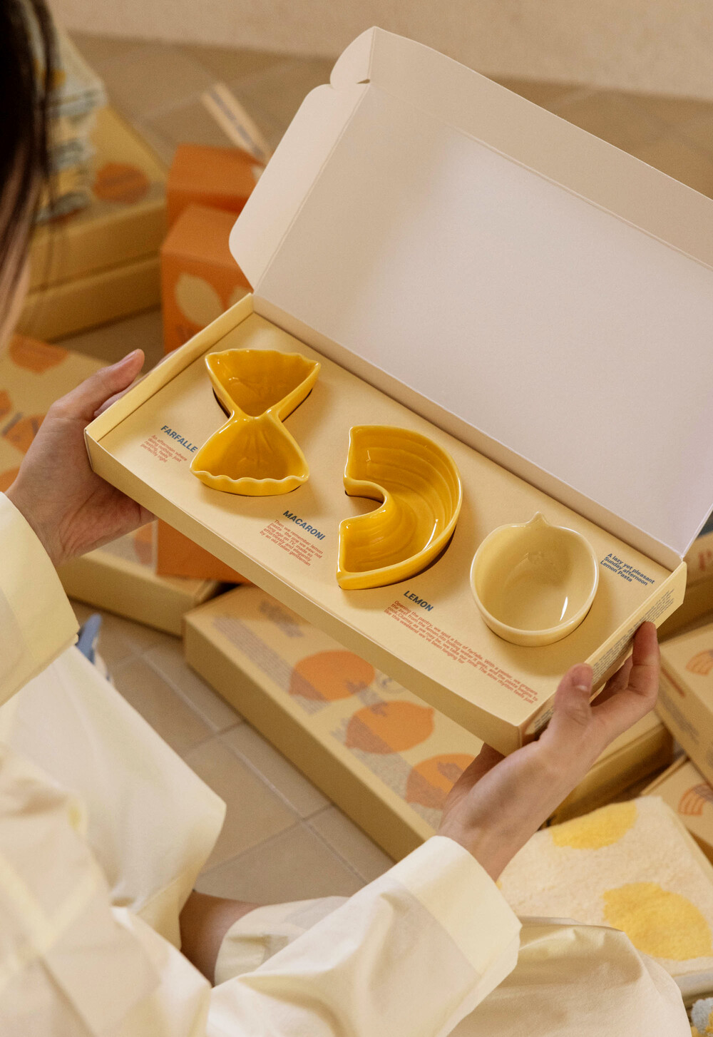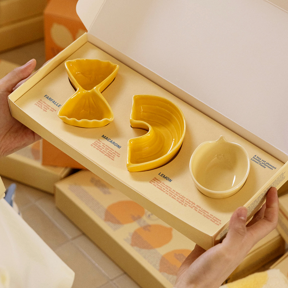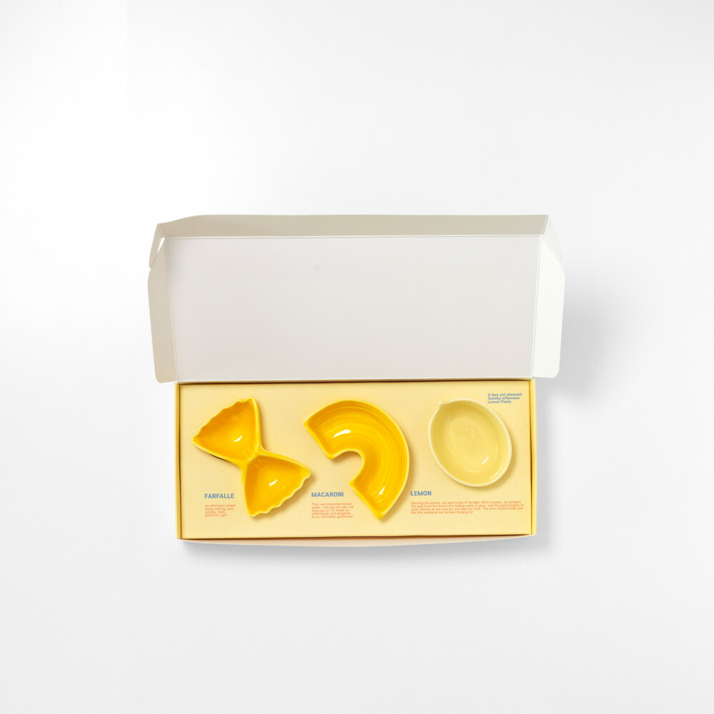 [ 레몬파스타 볼 3종 기프트 세트 ]  주말에 만나는 기분 좋아지는 음식에서 영감을 받은 시리즈로 레몬 파스타를 컨셉으로 전개한 도자기 그릇 3종 기프트 세트입니다. 마카로니면과 파르펠레면 모양의 볼과 레몬 모양의 볼로 총 3종이 함께 구성되어 있습니다. 옐로우 컬러가 포인트를 줄 수 있는 제품들로 테이블 위에 포인트 그릇으로 추천하는 제품입니다. 파스타면 패키지에서 영감을 받은 전용 패키지에 담겨 출고 됩니다.  일상에 위트를 더할 수 있는 디자인으로 쉼과 즐거움을 전하고 싶은 분에게 기프트 상품으로도 추천합니다. 마카로니면 볼 1개, 파르펠레면 볼 1개, 레몬볼 1개로 총 3개의 상품이 전용 패키지에 포장되어 출고됩니다.  구성 : 파르펠레면 볼 1p, 마카로니면 볼 1p, 레몬볼 1p 사이즈 : 파르펠레면 9 x 6 x 3 / 마카로니면 10 x 6 x 3 / 레몬볼 6 x 8 x 3  [사용 안내] 도자기 제품은 전자레인지과 식기세척기 사용 가능합니다. 오븐은 사용시 일부 색이 변할 수 있어 추천하지는 않습니다. (180도 10분 정도 내의 짧은 시간 사용은 가능하나 200도 이상에서 10분 이상 사용은 추천하지 않습니다.) 제조 : korea