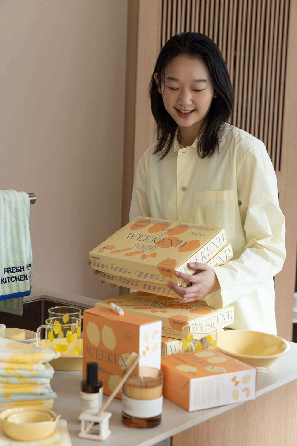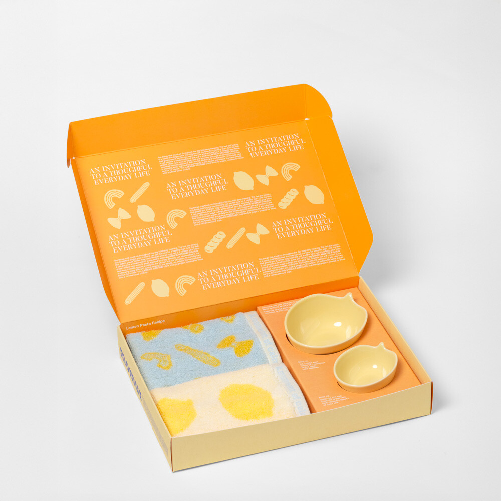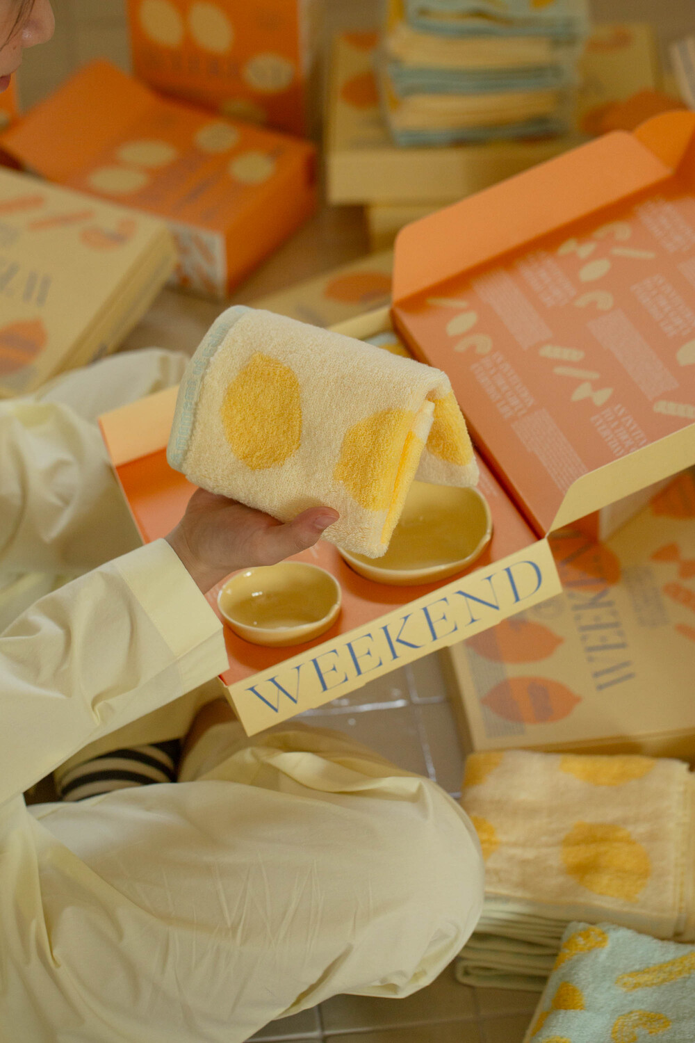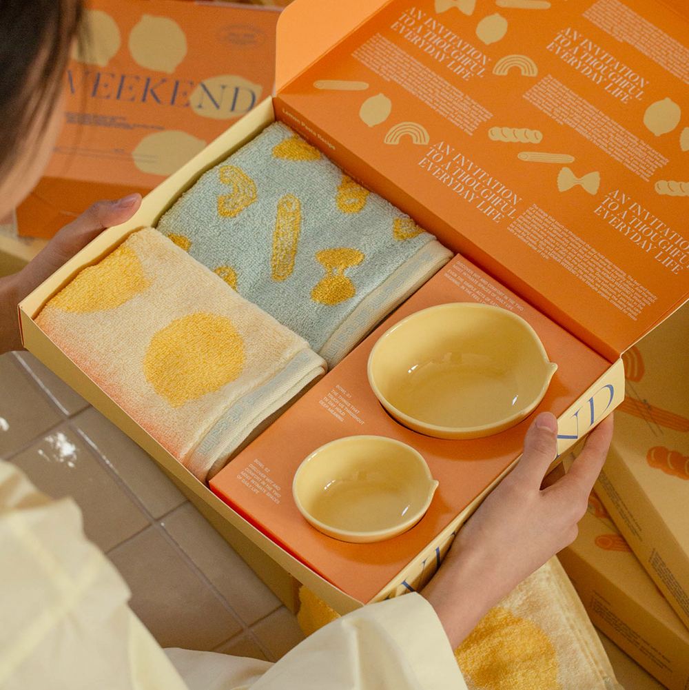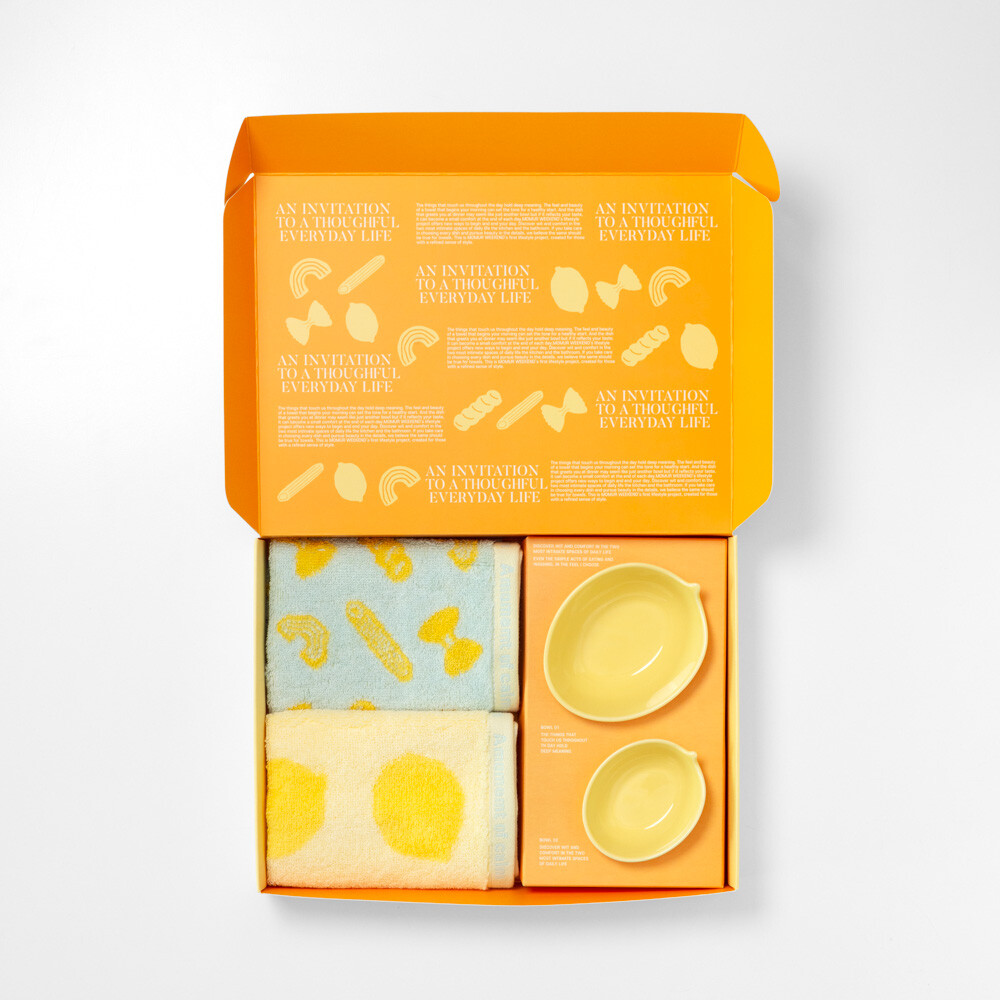 주말에 만나는 기분 좋아지는 음식에서 영감을 받은 시리즈로 레몬 파스타를 컨셉으로 타월과 도자기 제품들에 디자인 요소를 담았습니다. 레몬색 바탕에 레몬 패턴이 들어간 레몬 핸드타월과 민트빛 스카이블루 바탕에 파스타면들이 패턴으로 들어간 파스타 핸드타월과 다용도 레몬볼 도자기가 함께 구성된 기프트 상품입니다.