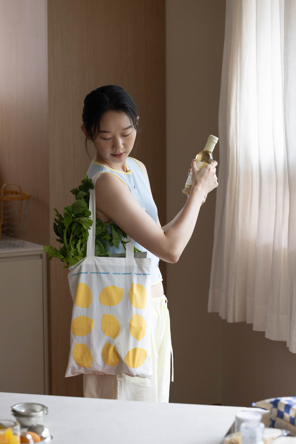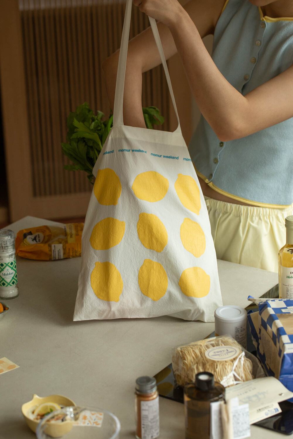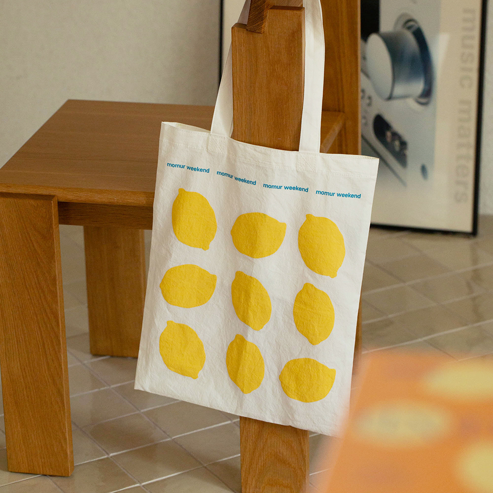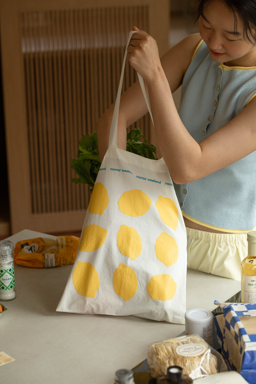 [ 레몬파스타 가방 ]  주말에 만나는 기분 좋아지는 음식에서 영감을 받은 시리즈로 레몬 파스타를 컨셉으로 전개한 시리즈입니다. 고밀도 화이트 원단에 레몬 패턴이 반복적으로 들어간 가방입니다. 데일리도 사용할 수 있는 제품이며, 고밀도 원단을 사용하여 일반 화이트 에코백보다 감도가 높은 제품입니다.  패브릭 가방은 오염이 되었을 경우, 전체 세탁보다는 해당 부분만 중성 세제로 조심스럽게 세척하는 걸 추천합니다.  구성 : 가방 1개 사이즈 : 가로 30cm 세로 38cm (끈길이 29) 제조 : korea