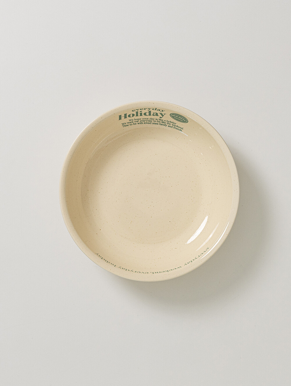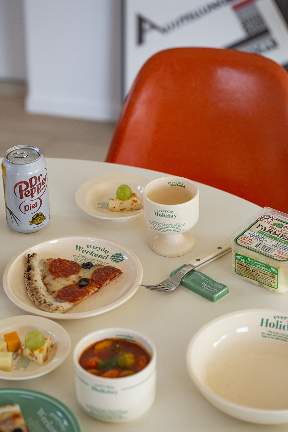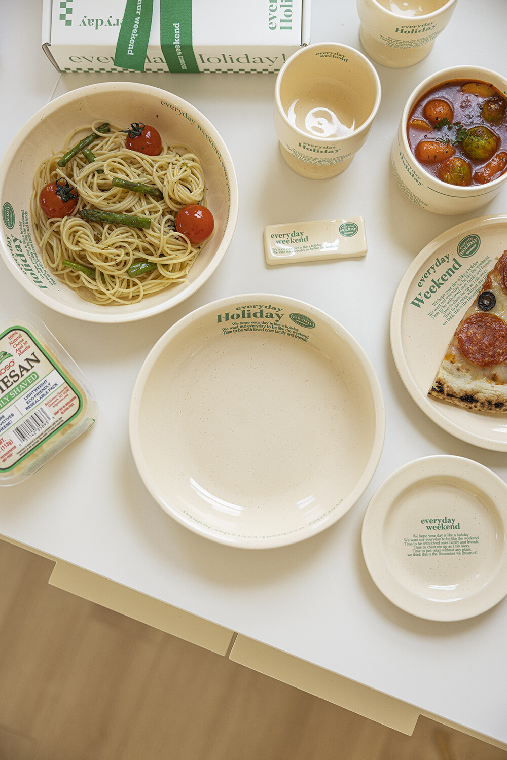 파스타, 샐러드, 밥 등 다양한 음식을 담을 수 있는 깊은 타입의 볼입니다. 디자인 뿐만 아니라 활용도도 높이기 위해 고민을 하고 제작된 제품입니다. 기존 위켄드 2, 3의 버터 컬러 유약과 같은 유약을 사용했습니다. 기존 시리즈와도 같이 사용하기 좋은 제품입니다. 버터 컬러 유약에 그린 레터링이 반영된 제품입니다.