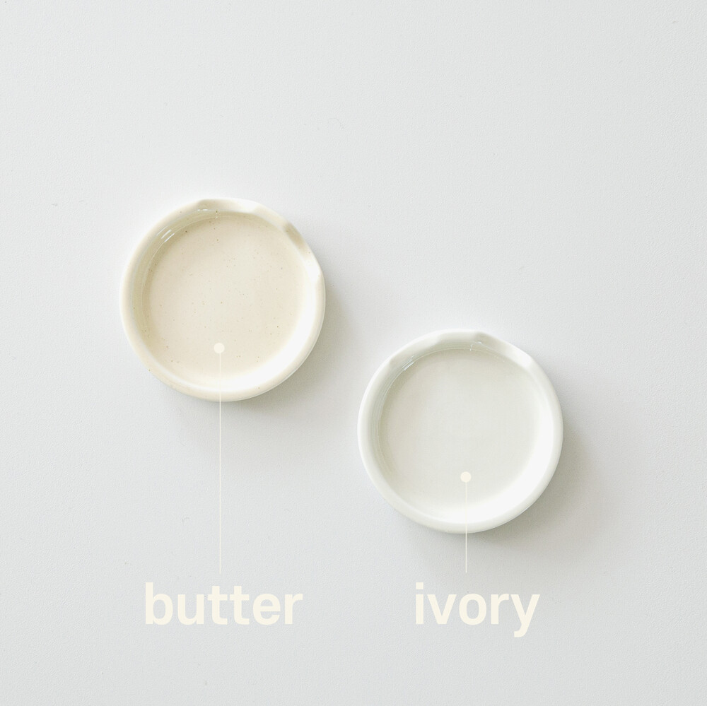 기존 에이프릴의 반무광 버전과 다른 유광 버전입니다. 이 점 참고 후 신중한 구매 부탁 드립니다. 아이보리 유약과 버터색 유약 2가지를 사용했습니다. 버터색 유약은 버터색에 은은한 점이 있는 유약입니다.