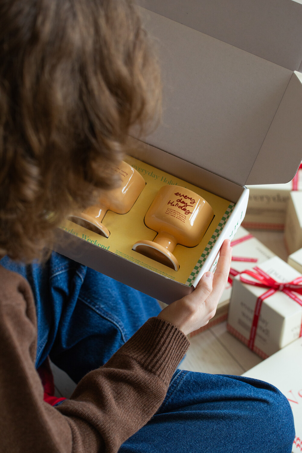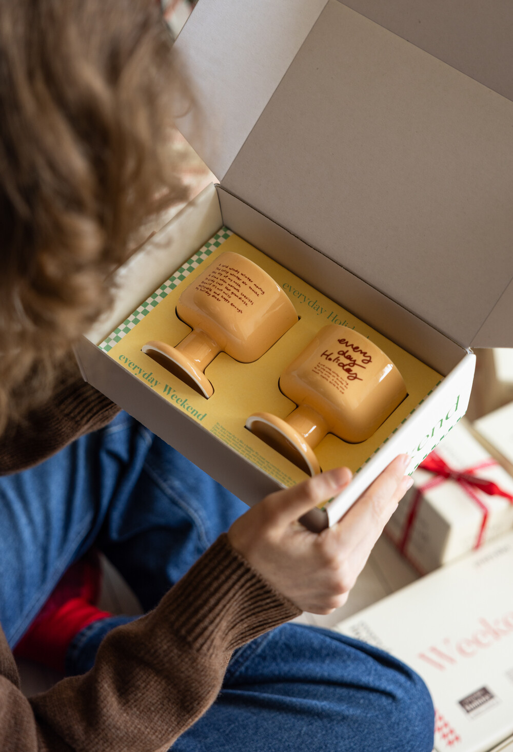홈파티, 디너 시간에 와인과 각종 음료를 담아 마실 수 있는 홀리데이 와인잔 2개 구성 기프트 상품입니다. 모머위켄드의 대표 상품인 와인잔의 2023 뉴버전으로 핸드프린팅이 들어가 더욱 빈티지한 감성을 연출할 수 있습니다.