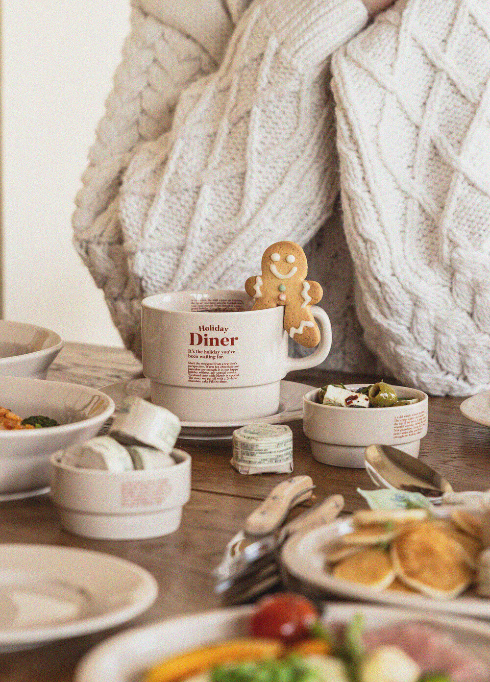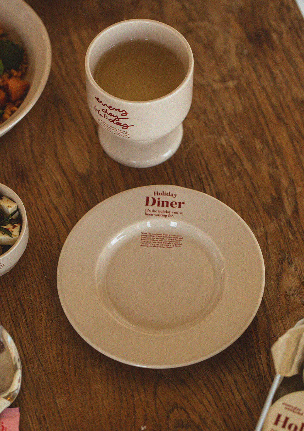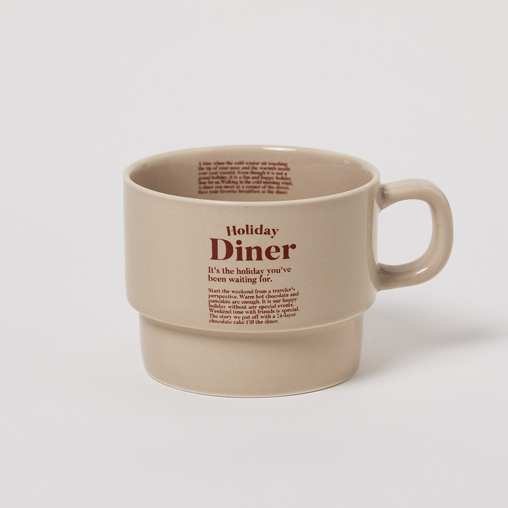 빈티지한 베이지색 유약에 홀리데이 다이너 그래픽 요소가 들어간 찻잔입니다.