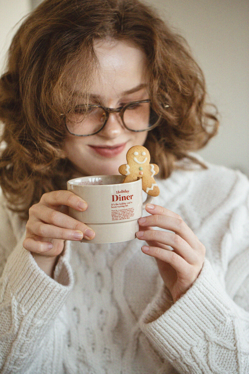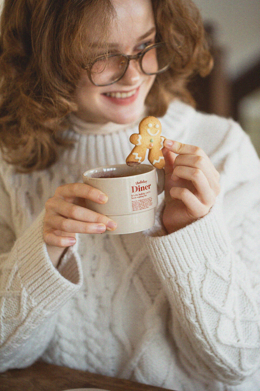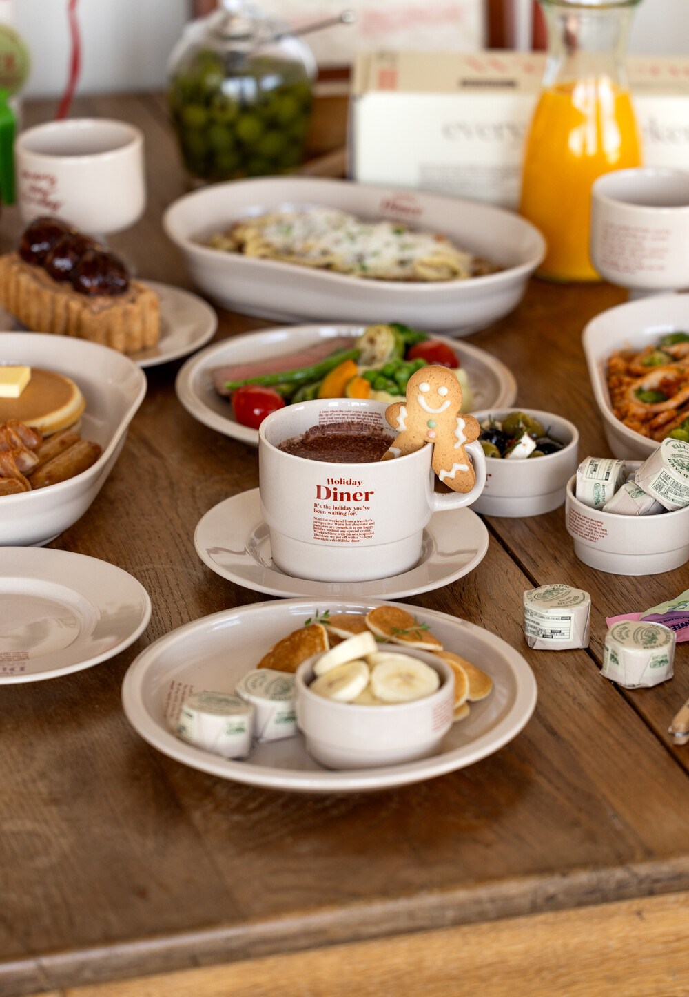 빈티지한 베이지색 유약에 홀리데이 다이너 그래픽 요소가 들어간 찻잔입니다.