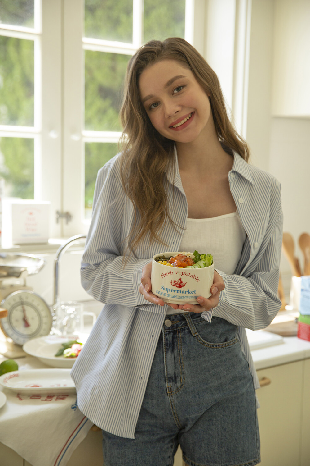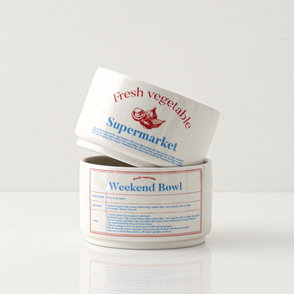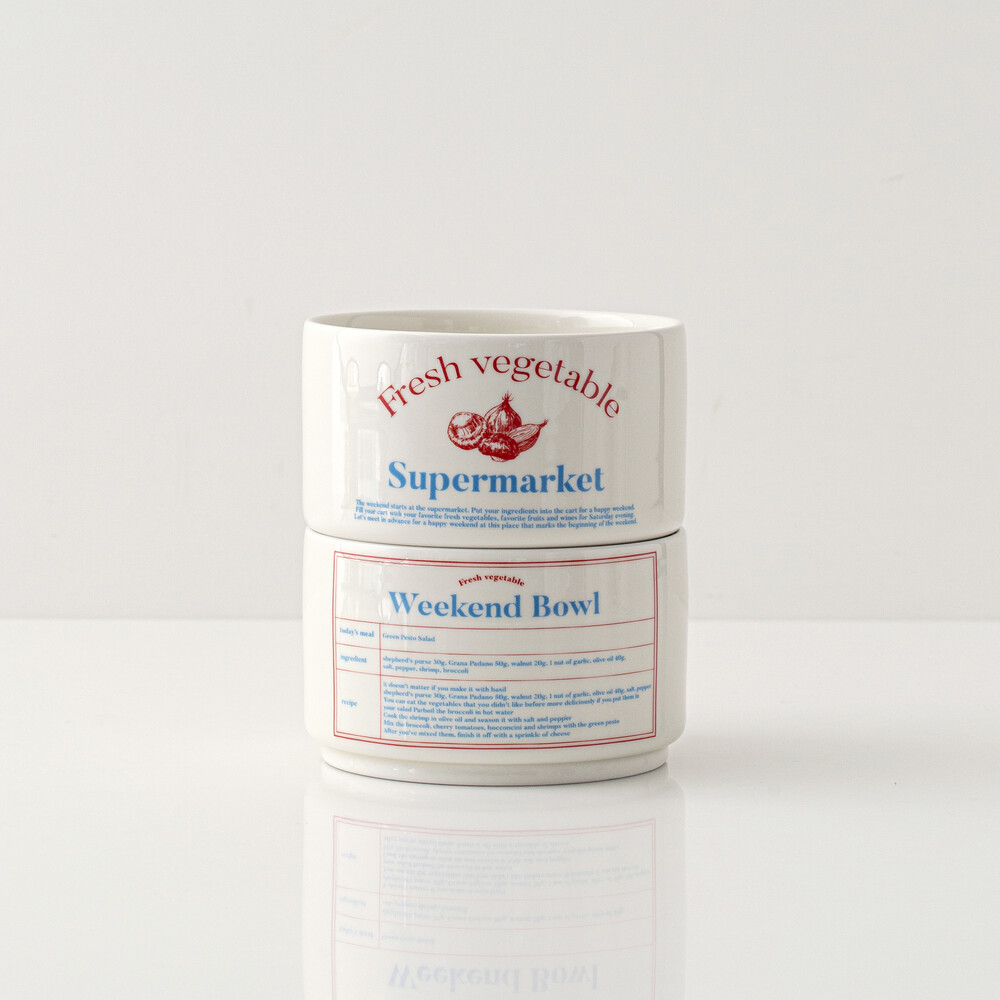 샐러드, 씨리얼, 요거트, 포케 등 다양한 음식을 담을 수 있는 실용적인 디자인의 볼입니다. 그릇 앞면에는 슈퍼마켓 라인의 메인 그래픽이 반영되어 있으며, 뒷면에는 위켄드볼 레시피가 반영되어 있습니다. 주말 나를 위한 한그릇의 건강을 채워 보세요.