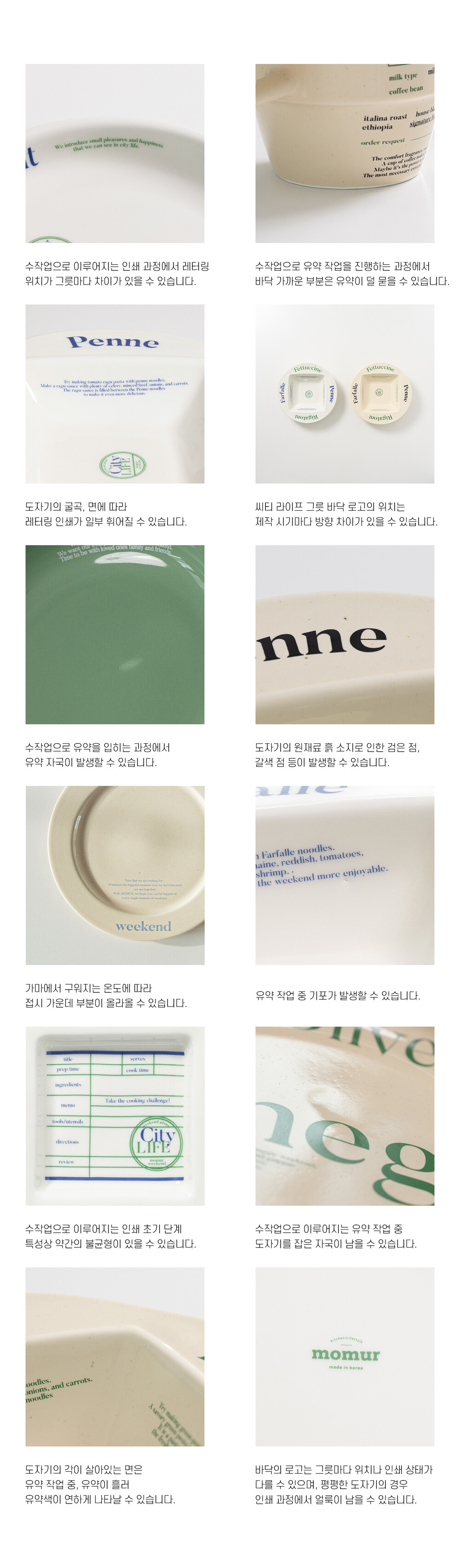 [구매 전 참고 사항] 제작 과정에서 도자기 소지로 인한 검은 점이 있을 수 있고 인쇄 작업을 통해 제작되는 과정에서 스크래치 등이 발생할 수 있습니다. 수작업을 통해 진행하는 인쇄 과정에서 인쇄 모양에 약간의 틀어짐이 발생할 수 있습니다. 가마 속 위치에 따라 온도에 차이가 있을 수 있어 그릇 가운데 부분이 일부 살짝 올라올 수 있습니다. 같은 유약이라도 가마 속 온도 차이에 따라 색이 약간 다를 수 있습니다. 바닥 로고 인쇄 과정에서 바닥에 약간의 얼룩이 발생할 수 있습니다. 색상에 따라 유약의 성질이 달라 금속 수저를 사용할 경우 흔적이 남을 수 있습니다. 위와 같은 이유로 교환/환불은 불가능하오니 고려하셔서 신중한 구매 부탁 드립니다.
