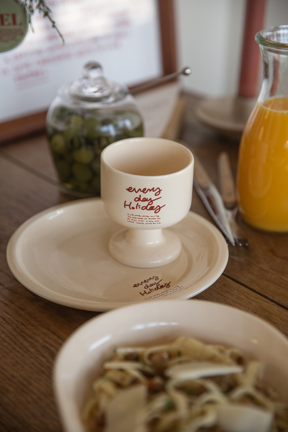 ‘에브리데이 홀리데이’ 테마가 핸드프린팅으로 들어간 원형 플레이트와 와인잔 세트입니다.