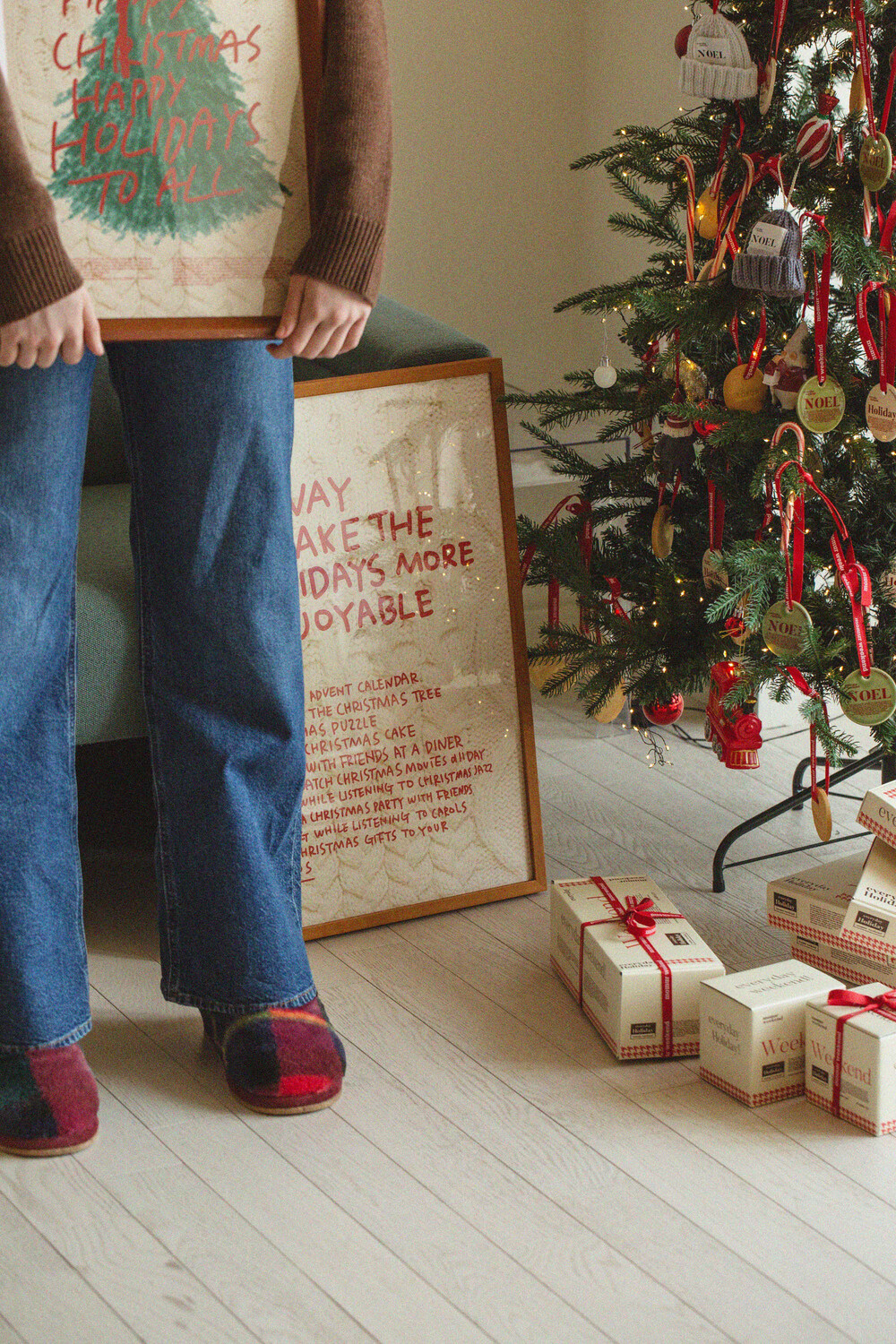 흰 바탕에 빨간색 레터링이 들어가 텍스트만으로도 충분히 홀리데이 무드를 연출할 수 있습니다.