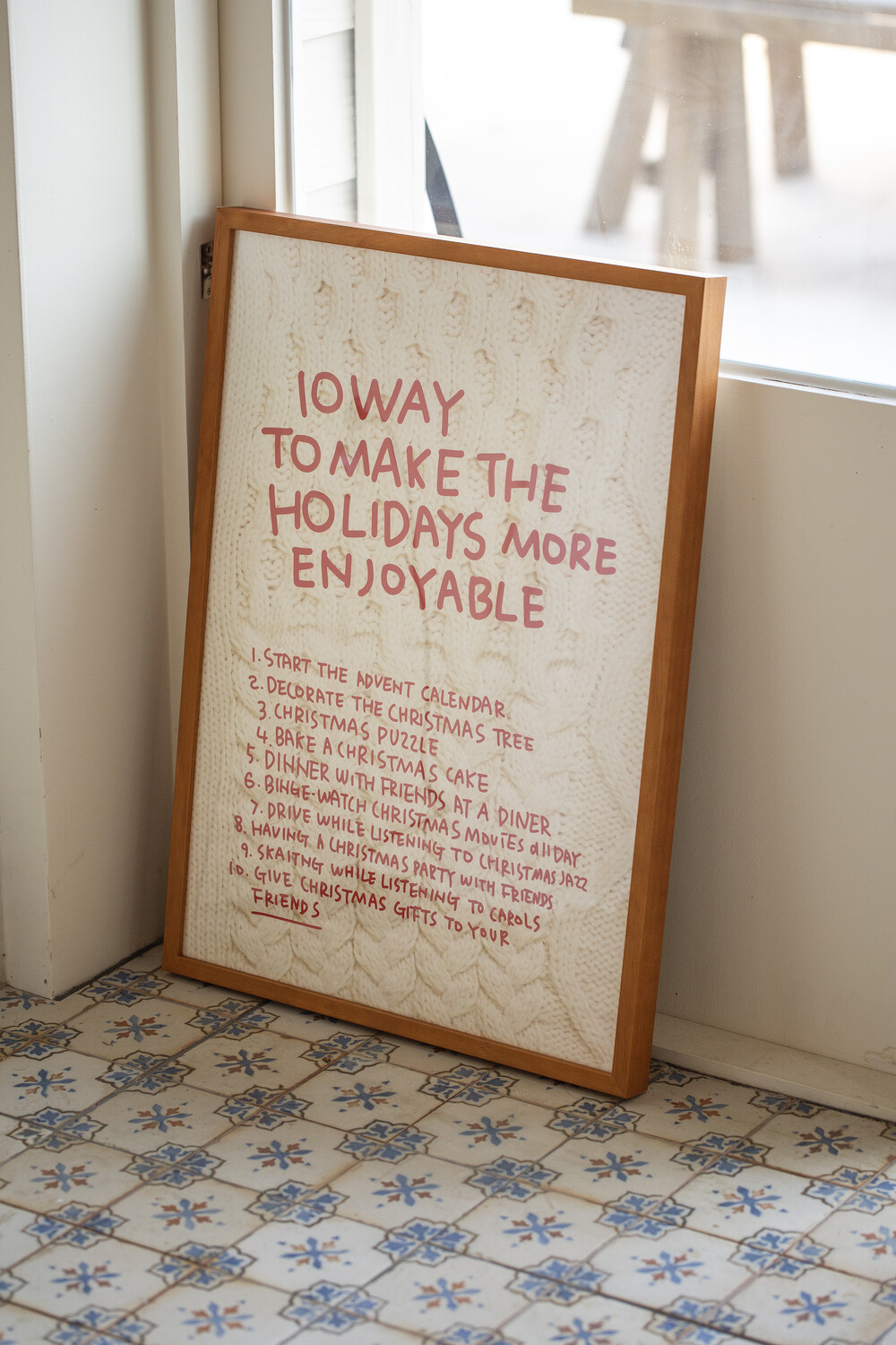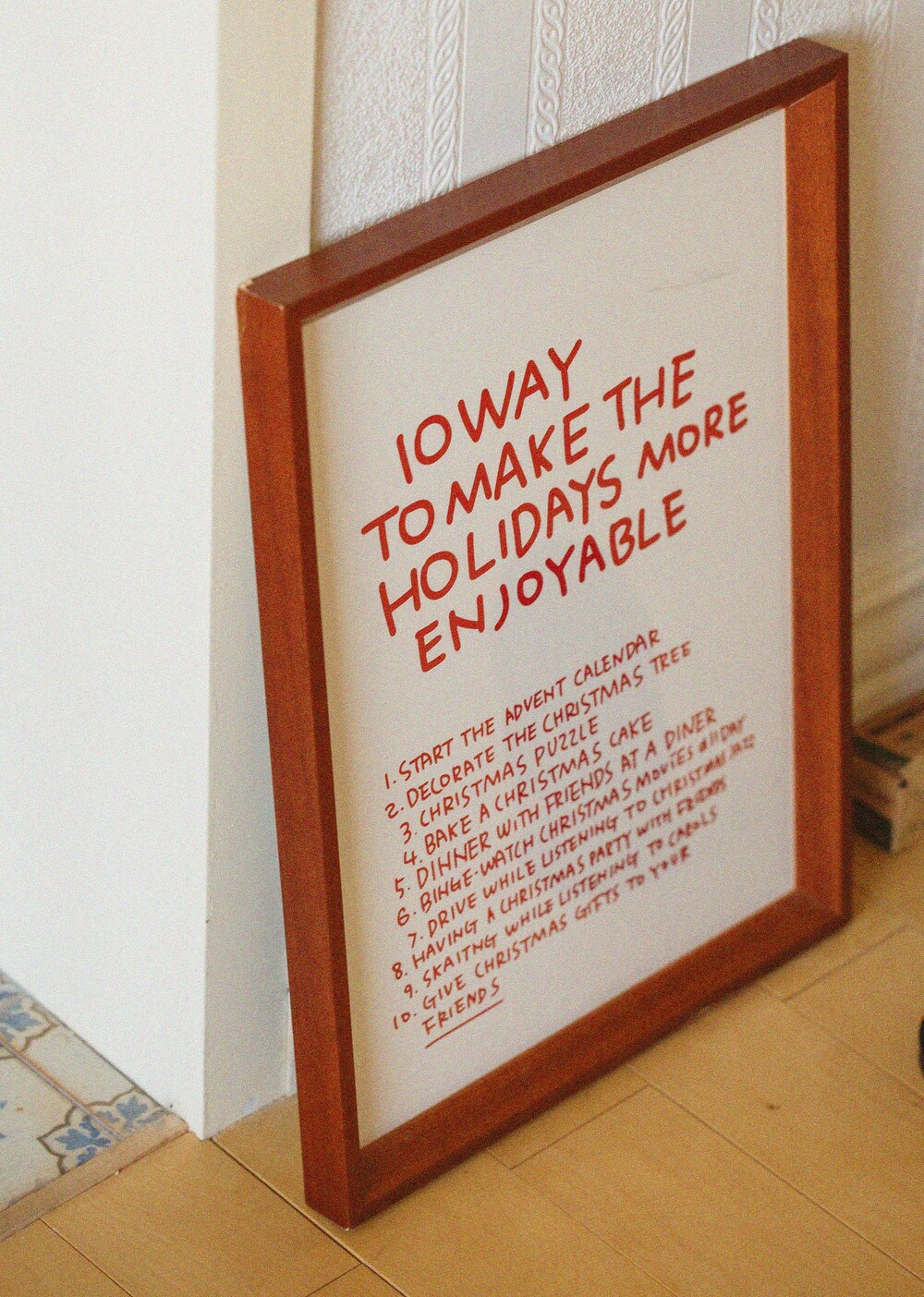 홀리데이를 즐겁게 보내는 방법 10가지가 핸드프린팅된 홀리데이 포스터입니다.