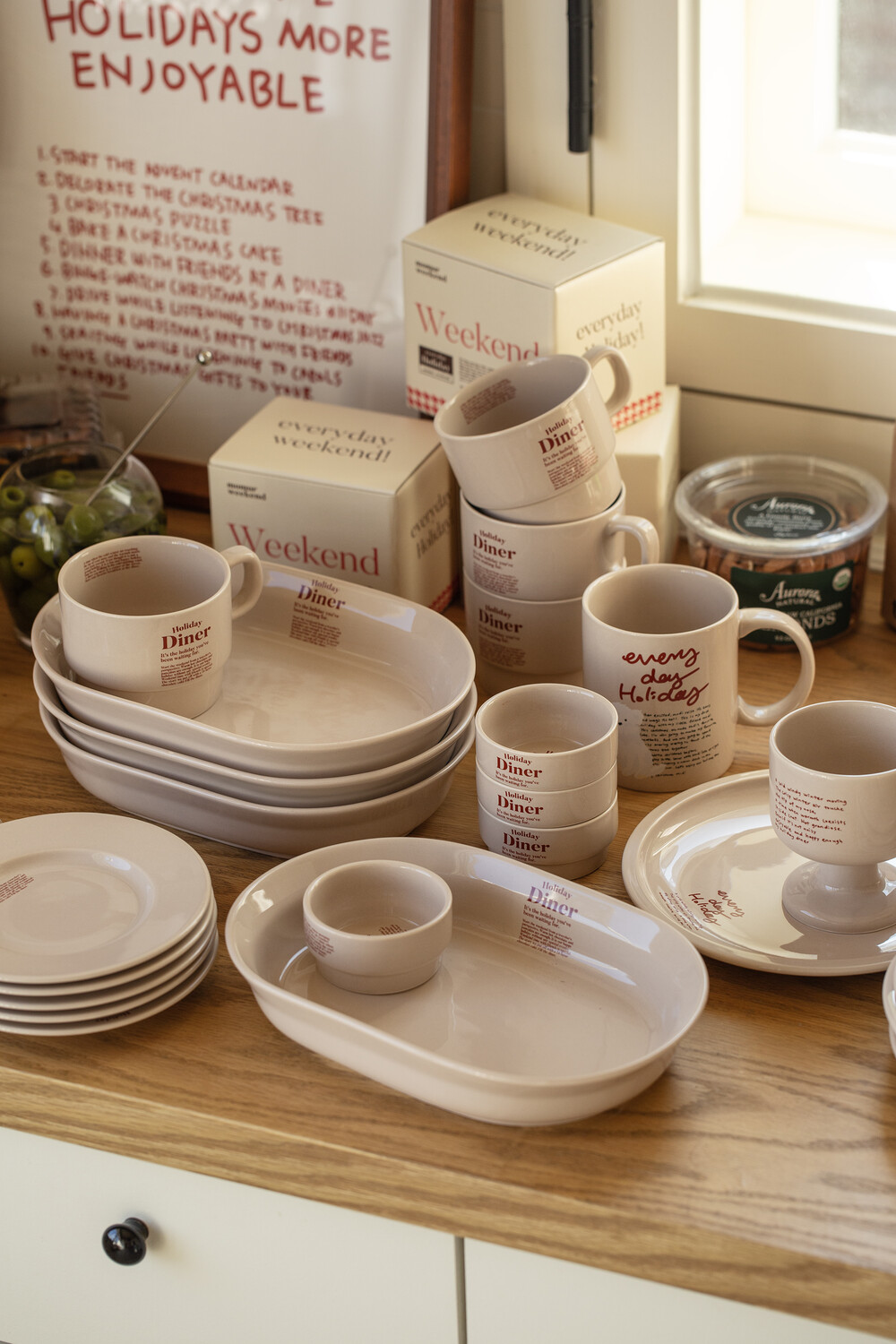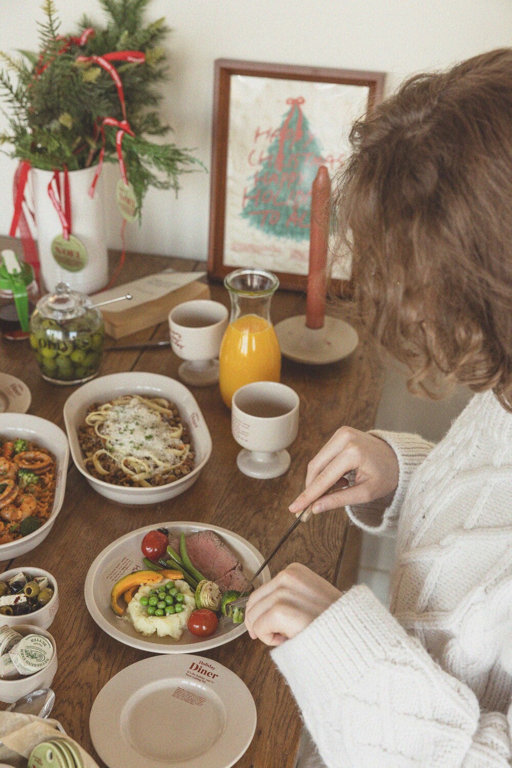 빈티지한 베이지색 유약에 홀리데이 다이너 그래픽 요소가 들어간 원형 플레이트입니다. 플레이트는 2022년 초록색 홀리데이 패키지에 담겨 출고됩니다.
