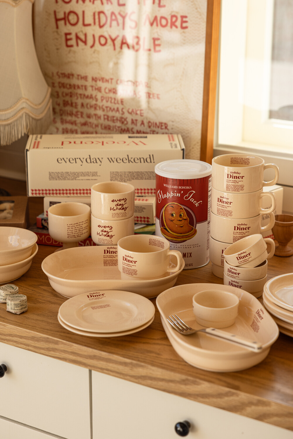 빈티지한 버터색 유약에 홀리데이 다이너 그래픽 요소가 들어간 원형 플레이트입니다. 플레이트는 2022년 초록색 홀리데이 패키지에 담겨 출고됩니다.