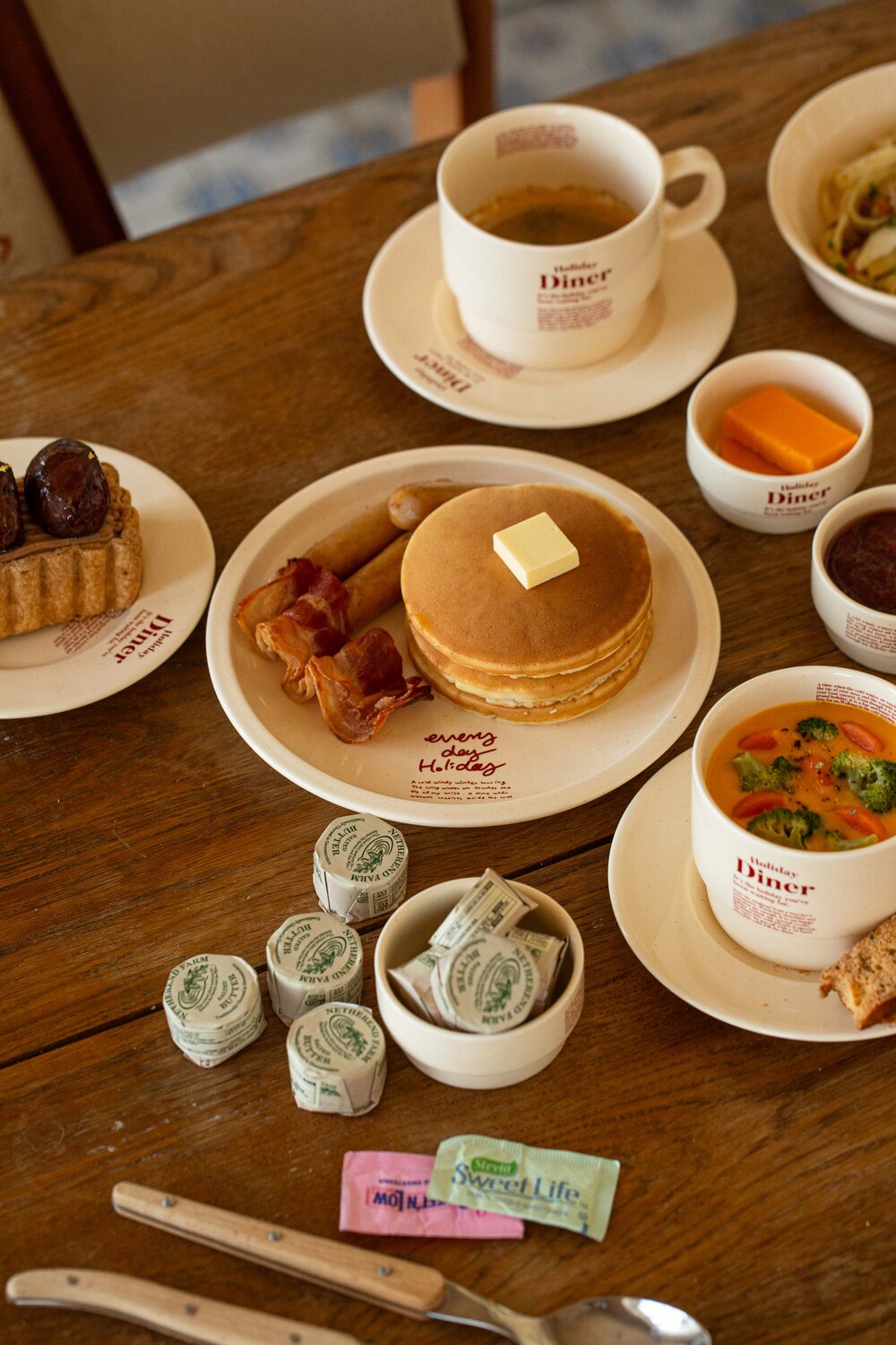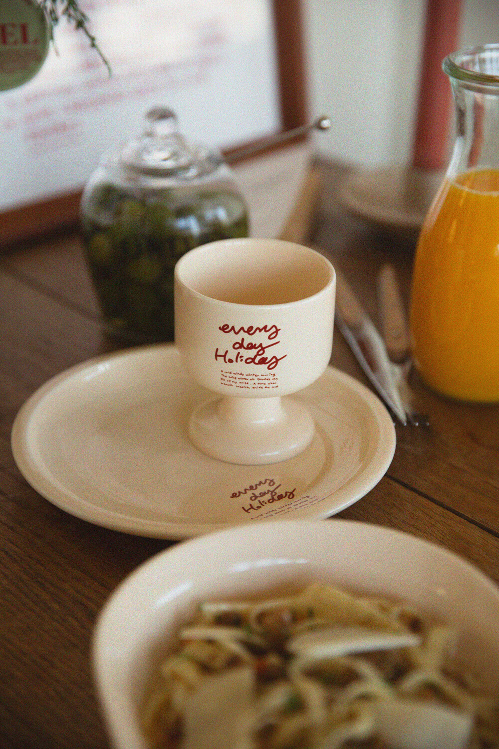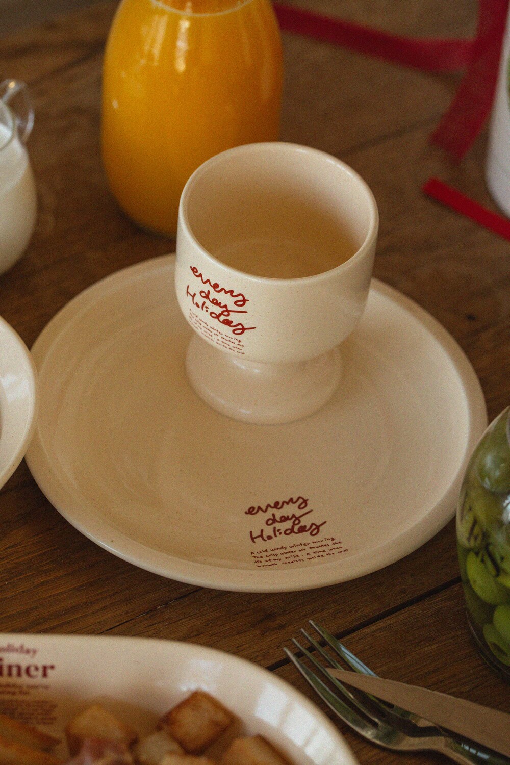 기본 원형 플레이트로 토스트, 케이크, 스테이크 등 다양한 음식을 담을 수 있는 제품입니다. ‘에브리데이 홀리데이’ 테마가 핸드프린팅으로 들어간 제품입니다.