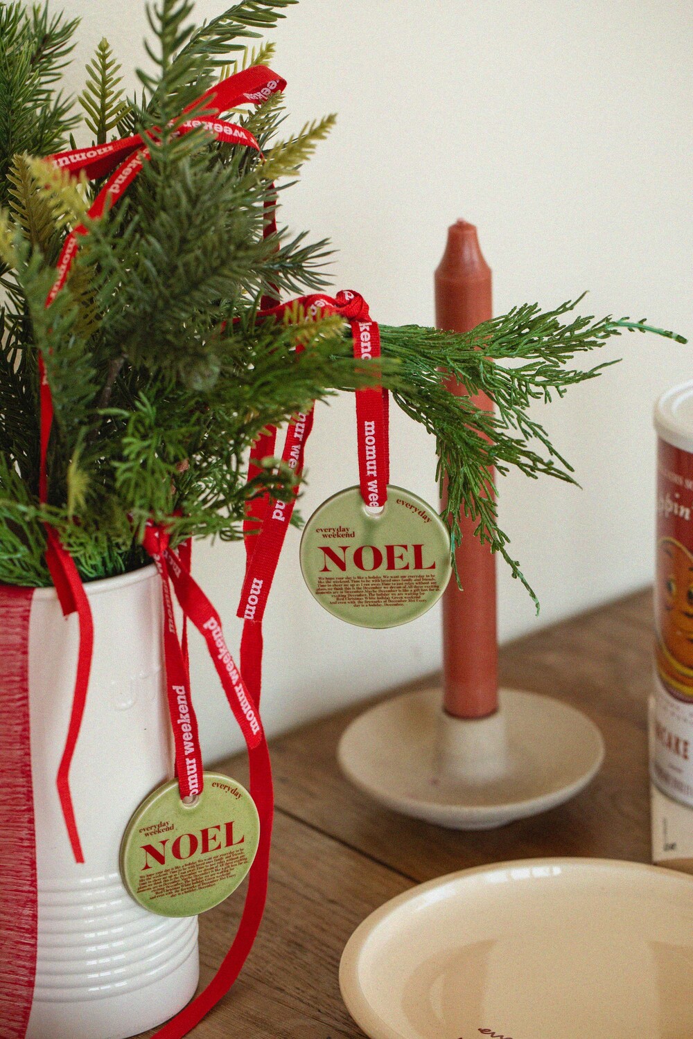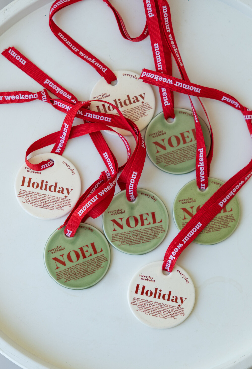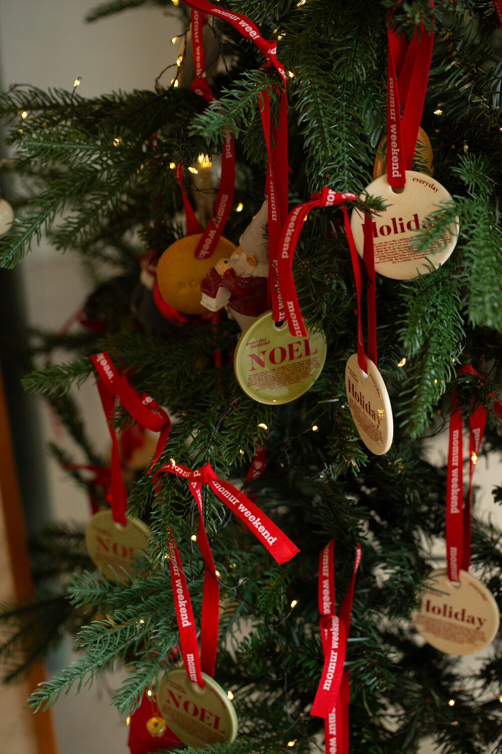 모머위켄드 홀리데이 시리즈의 메인 테마인 ‘에브리데이 홀리데이’와 ‘NOEL’이 들어간 도자기 오너먼트입니다. 전용 레드 리본과 함께 크리스마스 트리에 특별함을 더해 보세요.