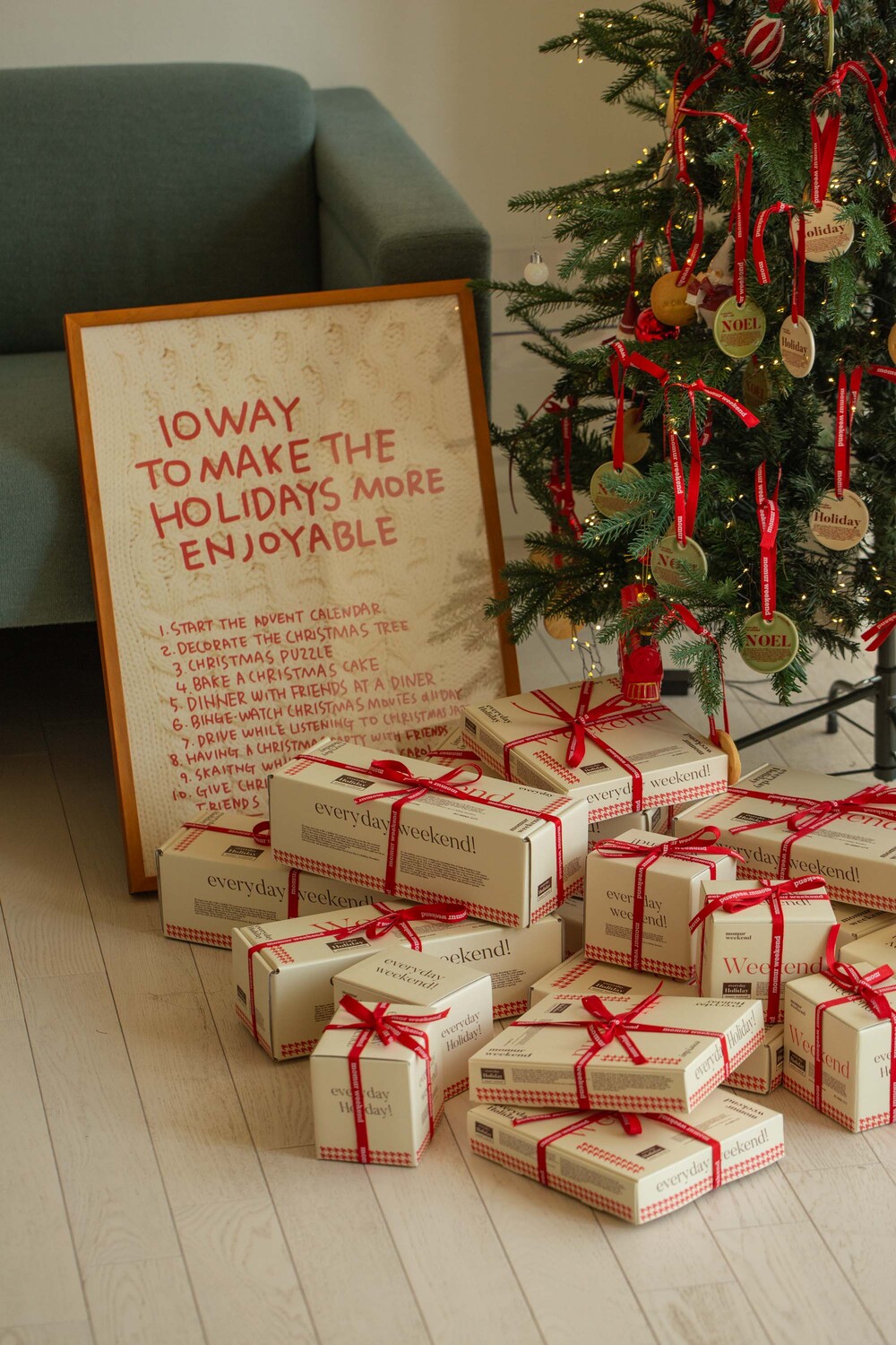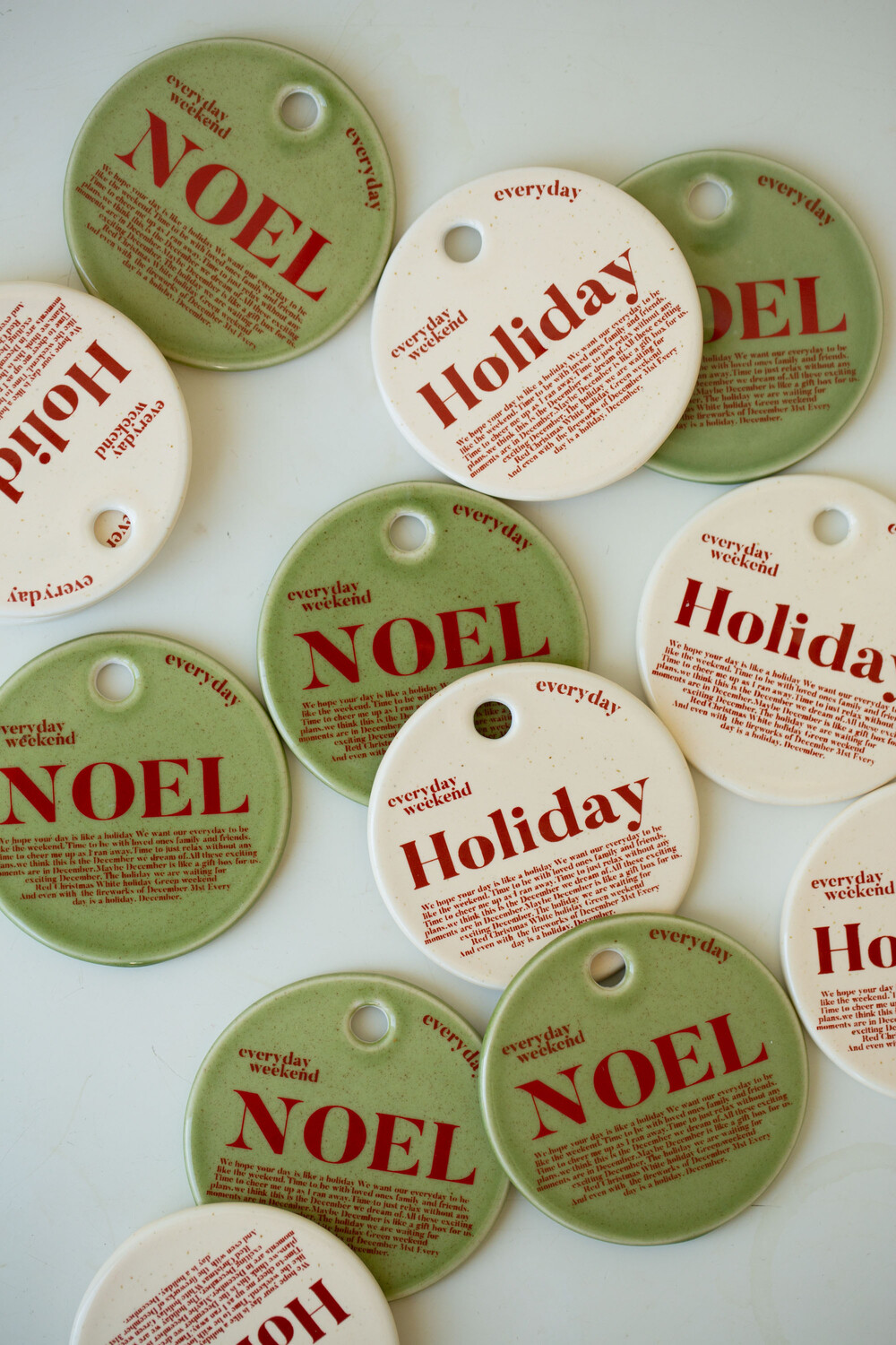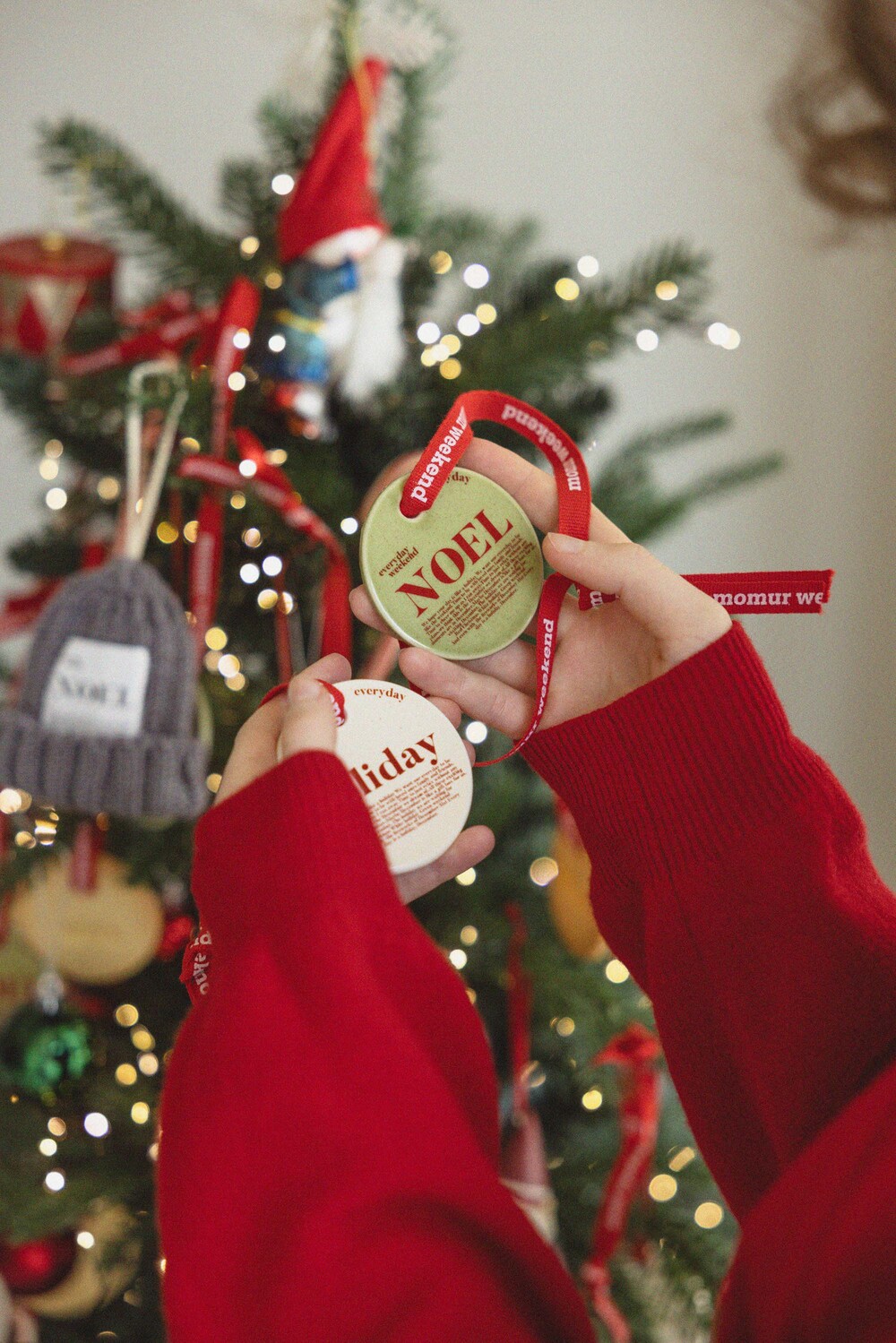 모머위켄드 홀리데이 시리즈의 메인 테마인 ‘에브리데이 홀리데이’와 ‘NOEL’이 들어간 도자기 오너먼트입니다. 전용 레드 리본과 함께 크리스마스 트리에 특별함을 더해 보세요.