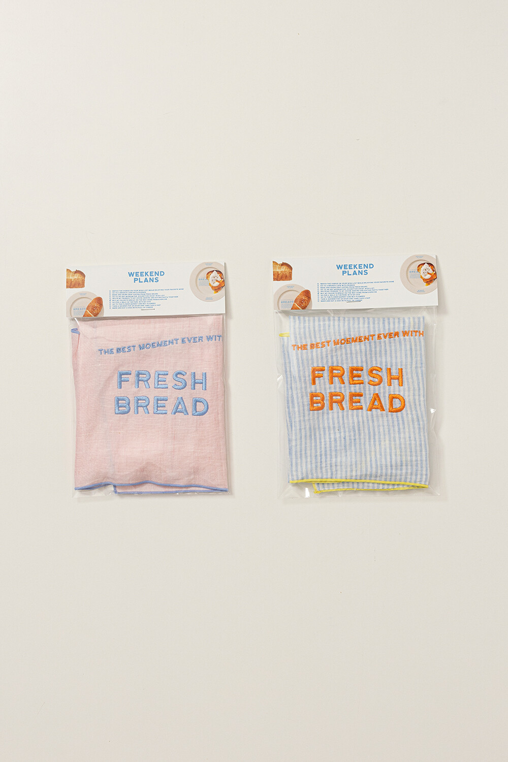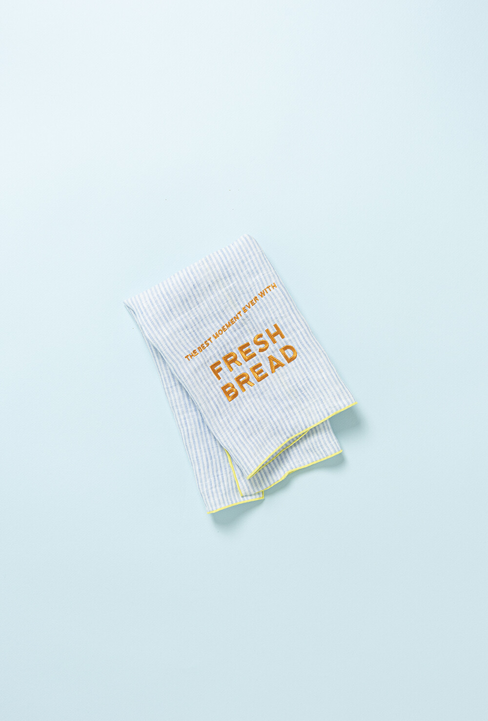 퀄리티 높은 리투아니아 린넨을 사용하였으며, 브레드 라인의 메인 그래픽 요소가 자수처리 되었습니다. 연한 스카이블루 스트라이프 린넨을 사용했습니다.