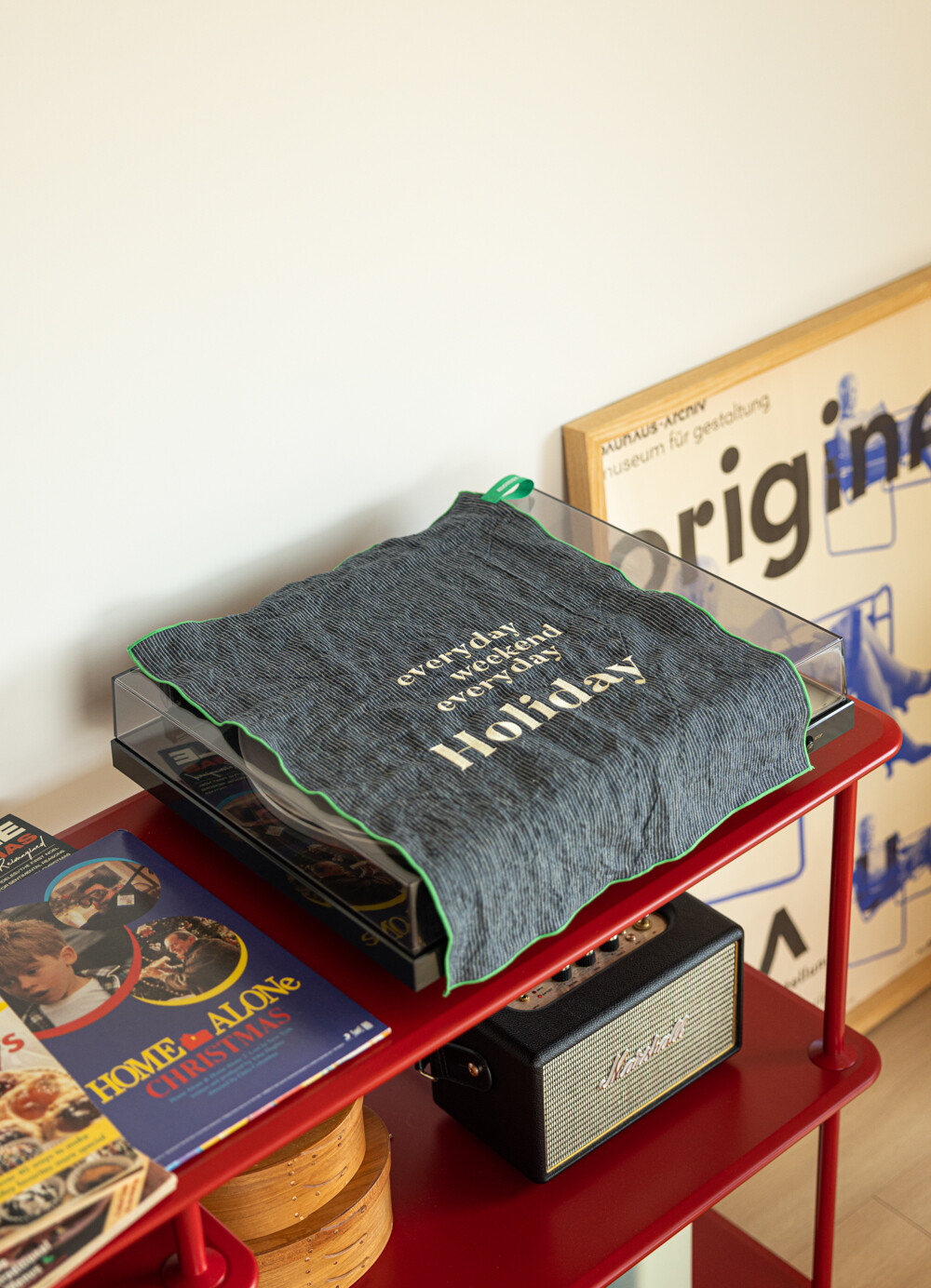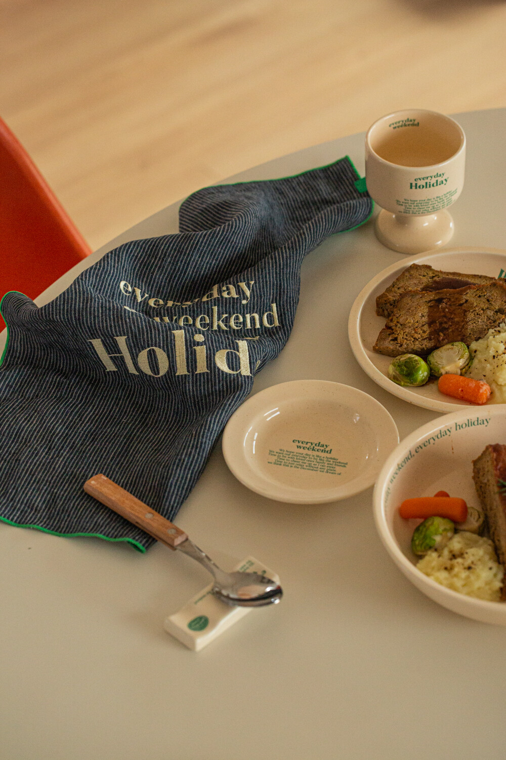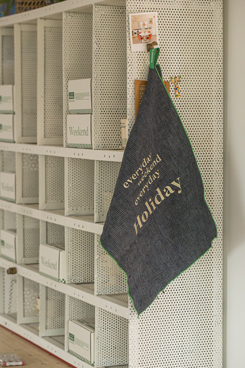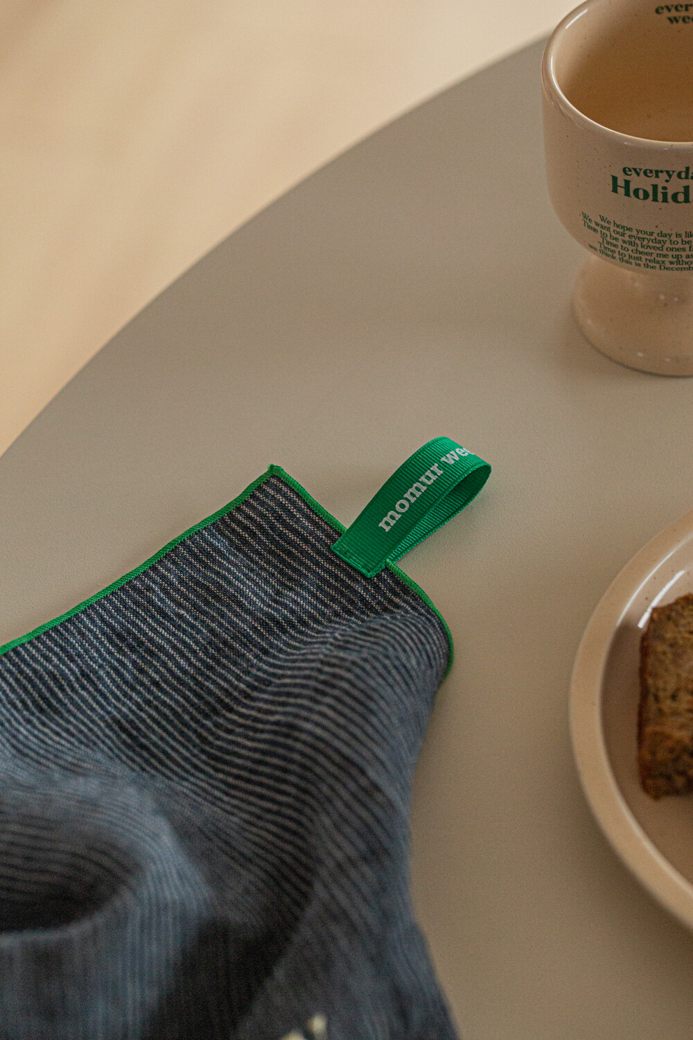 퀄리티 높은 리투아니아 린넨을 사용하였으며, 에브리데이 홀리데이의 메인 그래픽 요소가 자수처리 되었습니다. 네이비 스트라이프 린넨 원단에 초록색 실과 라벨로 포인트를 주었습니다.