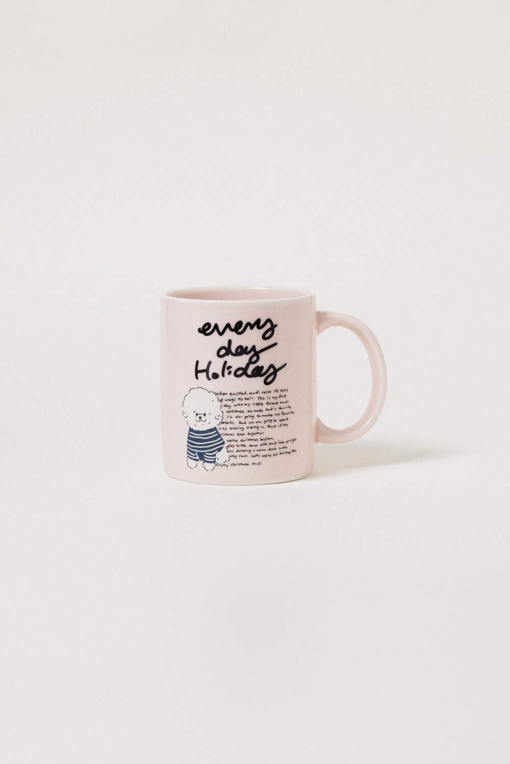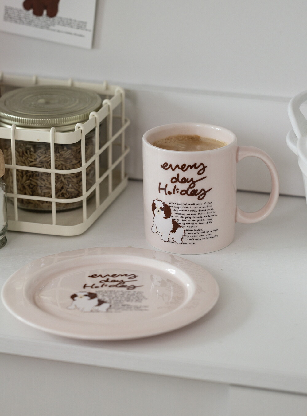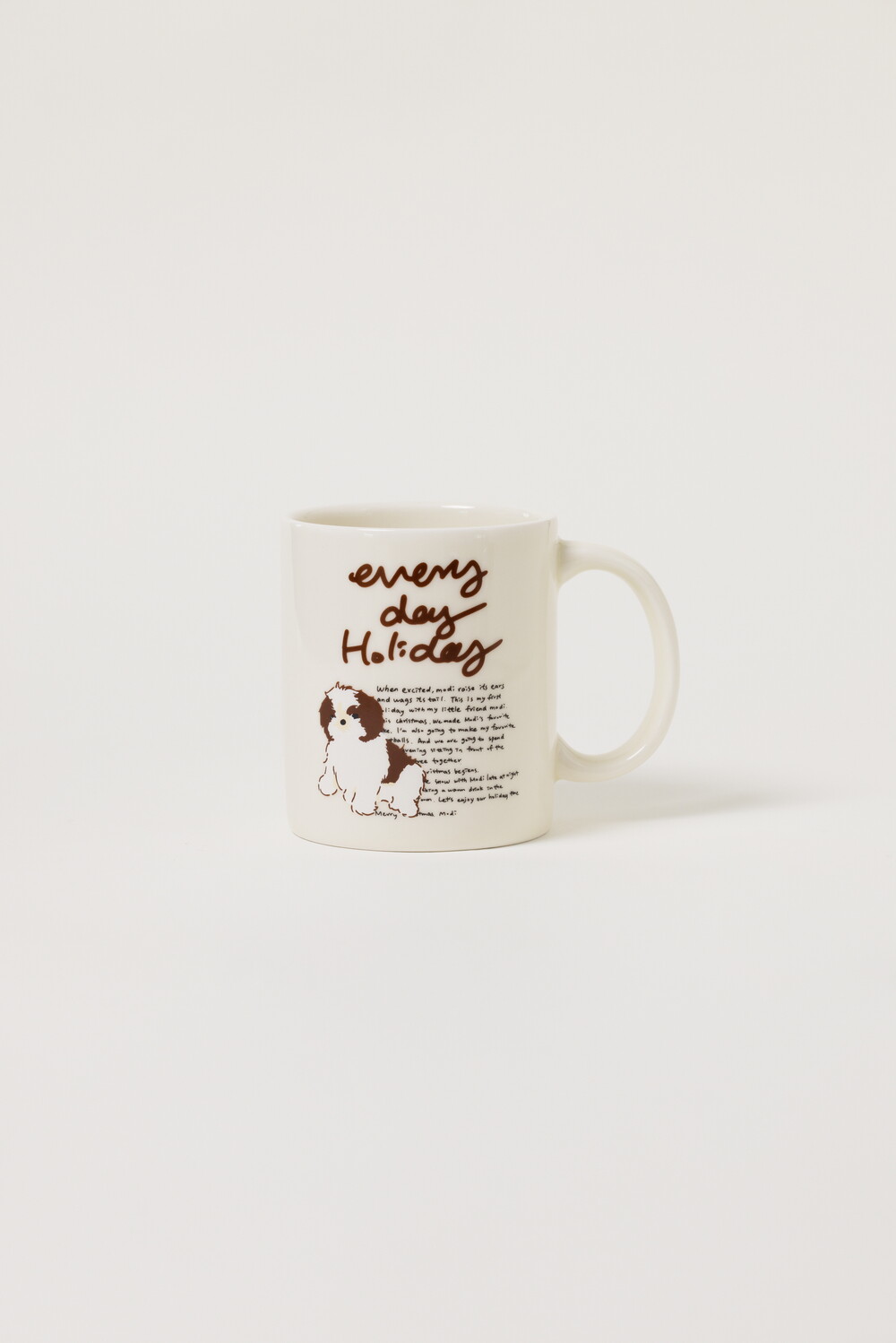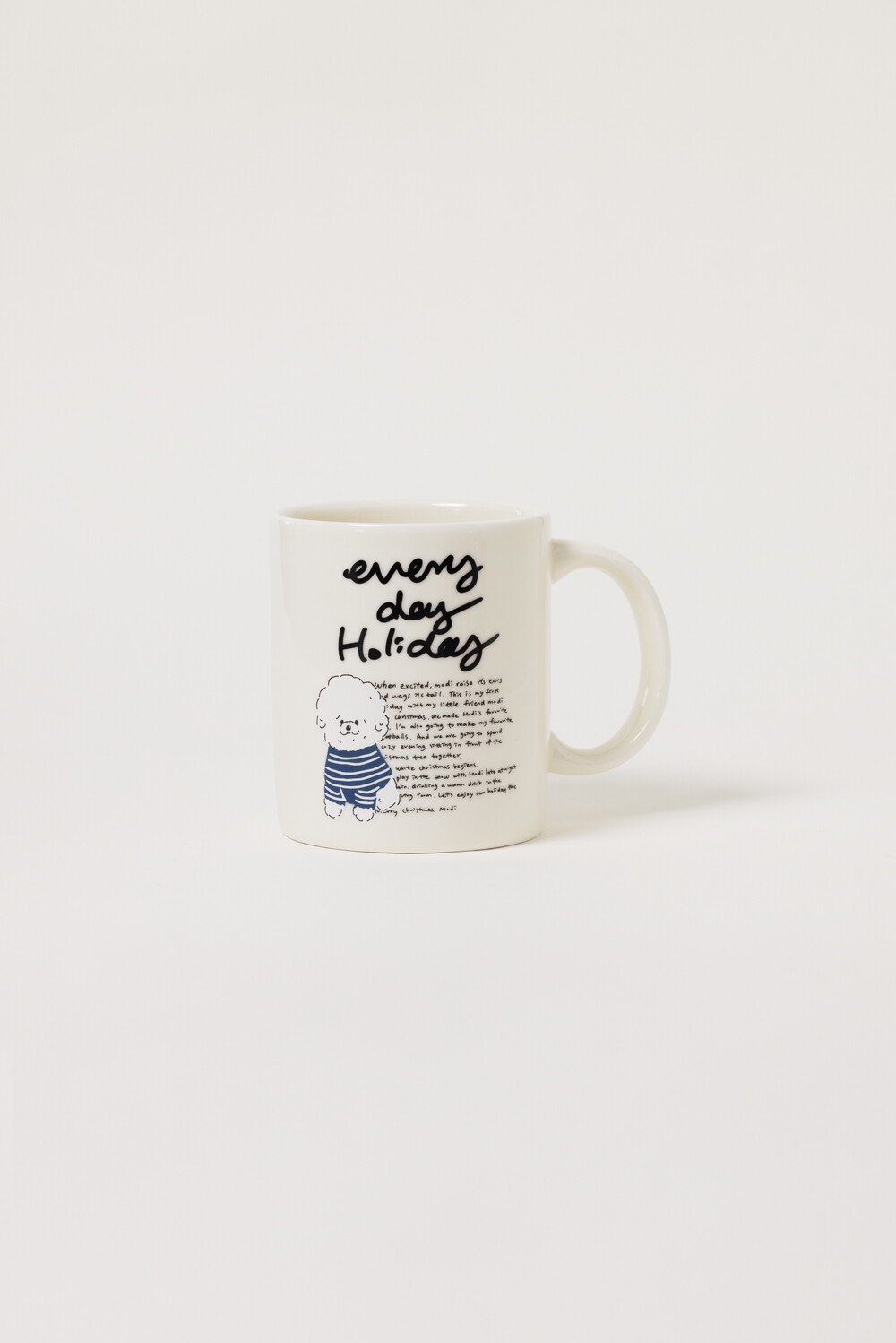 모머위켄드 홀리데이 메인 테마인 ‘에브리데이 홀리데이’ 레터링과 귀여운 강아지 그림이 들어간 도자기 제품입니다.