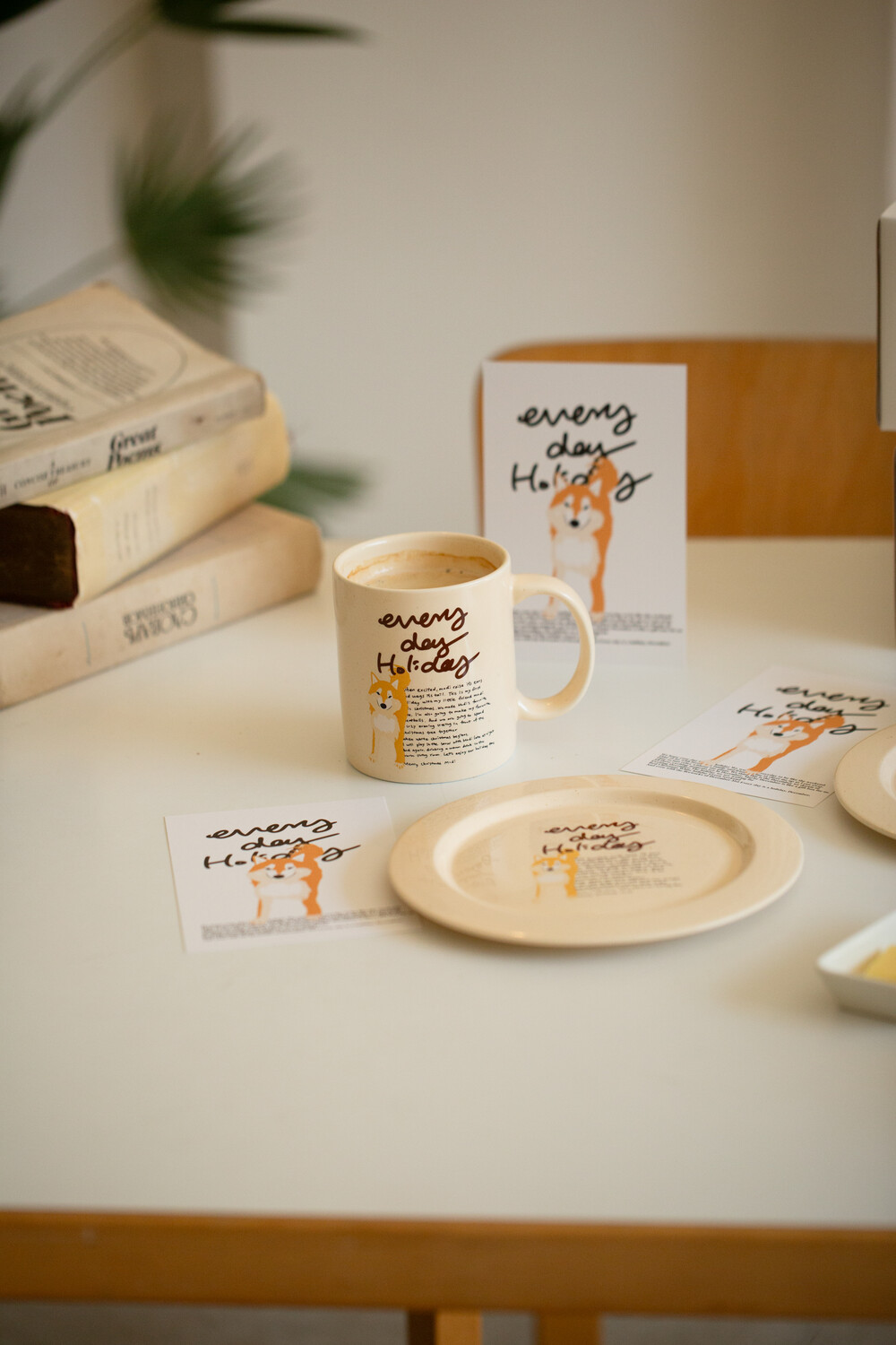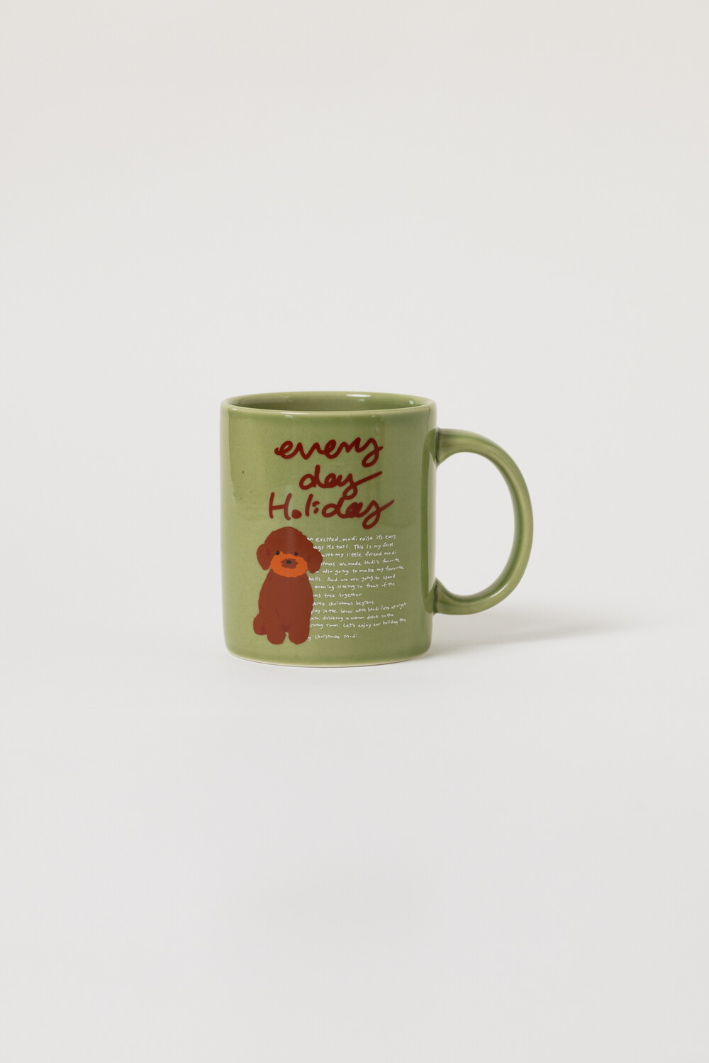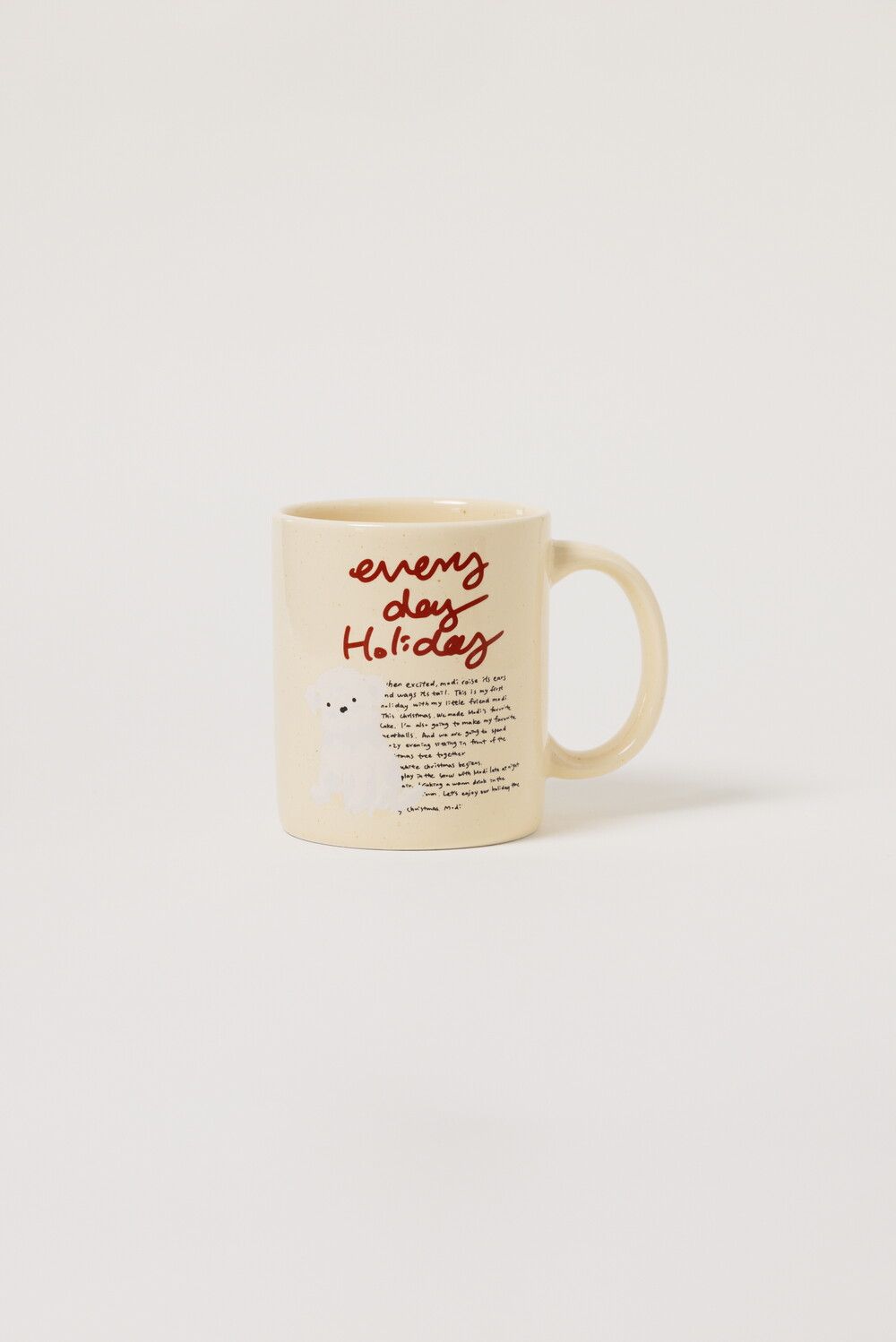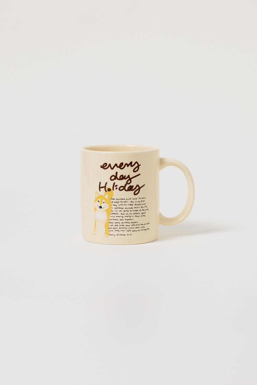 모머위켄드 홀리데이 메인 테마인 ‘에브리데이 홀리데이’ 레터링과 귀여운 강아지 그림이 들어간 도자기 제품입니다.