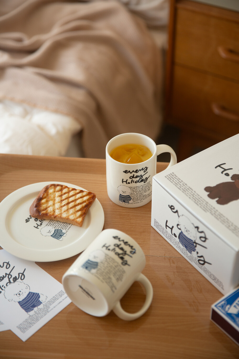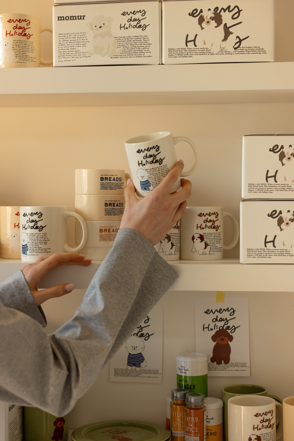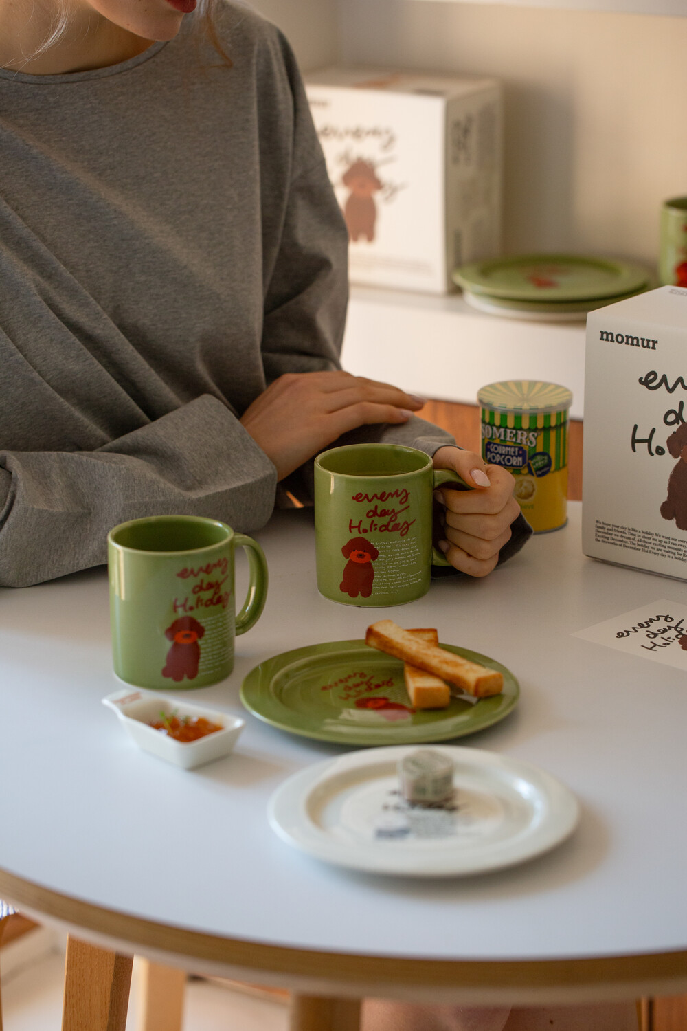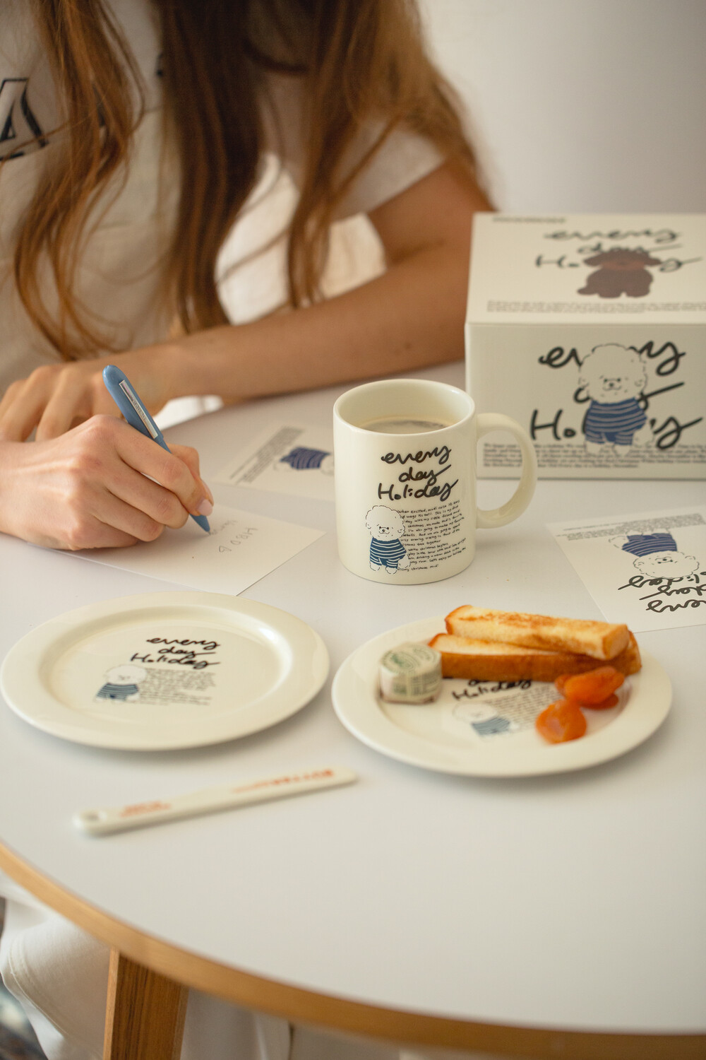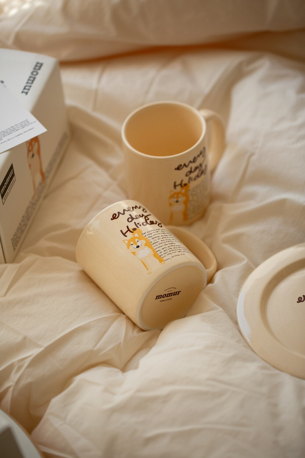 모머위켄드 홀리데이 메인 테마인 ‘에브리데이 홀리데이’ 레터링과 귀여운 강아지 그림이 들어간 도자기 제품입니다.