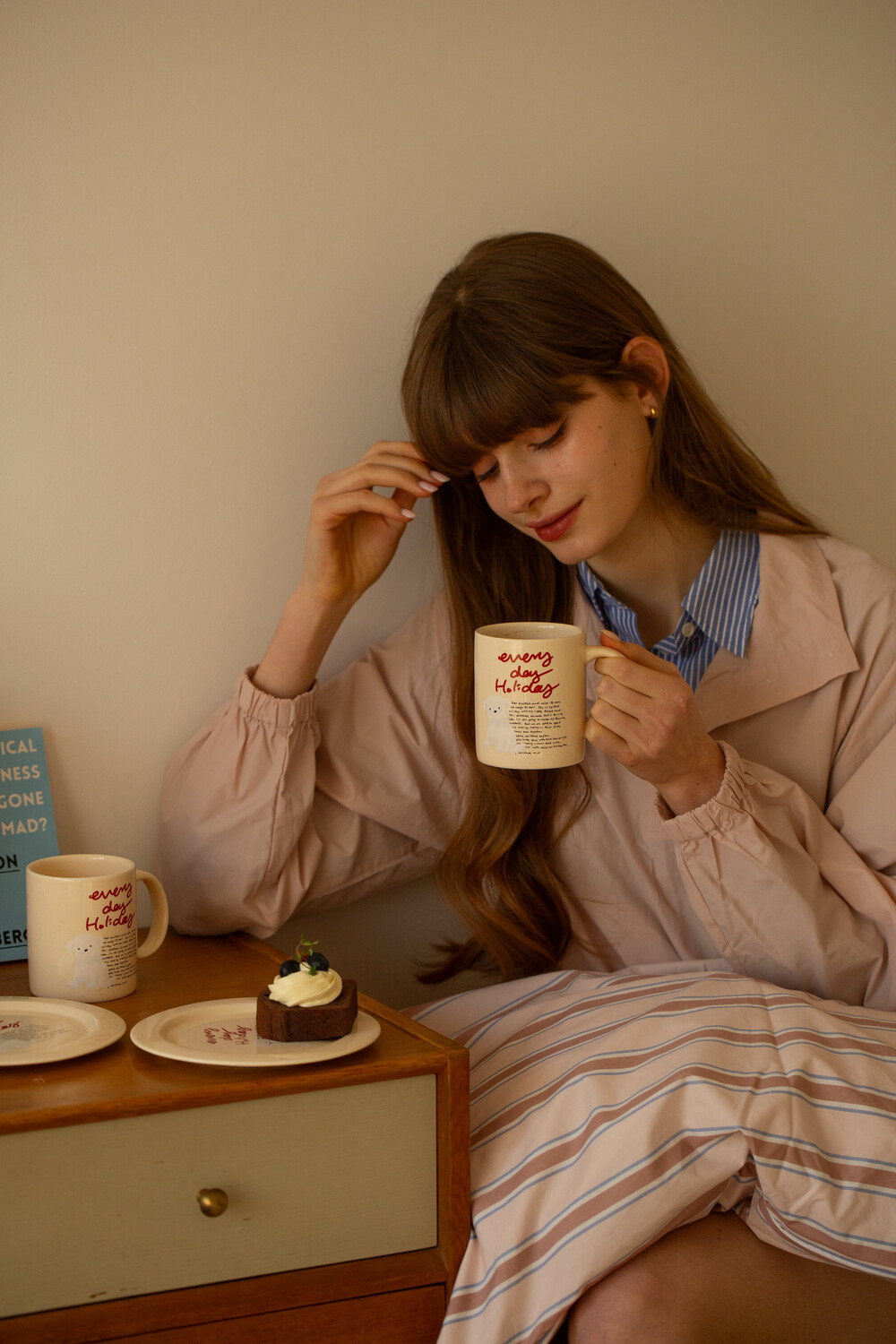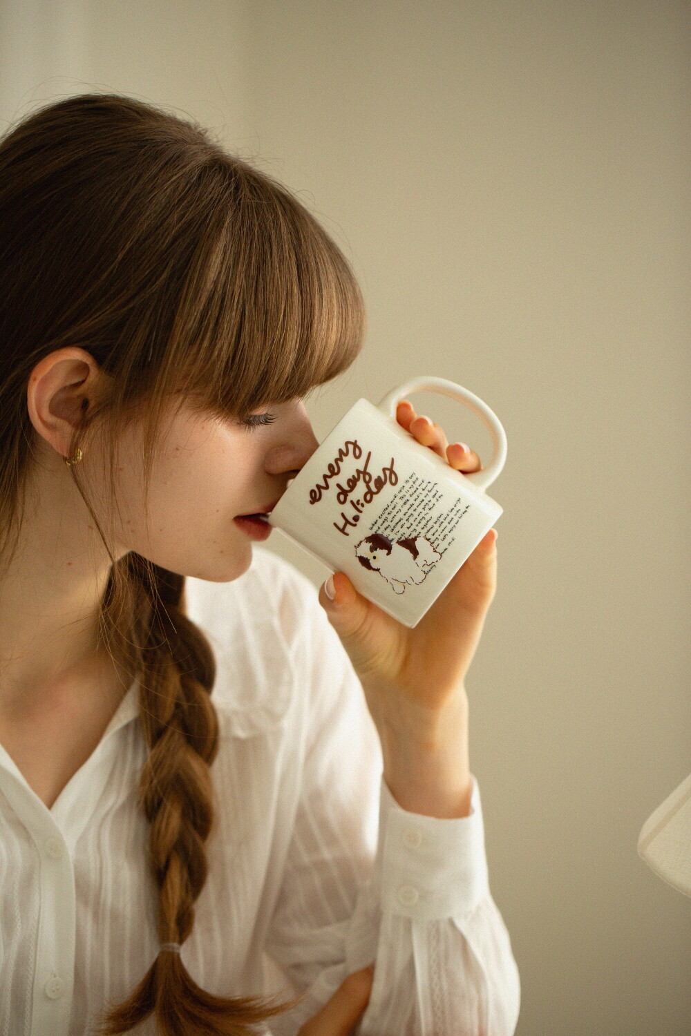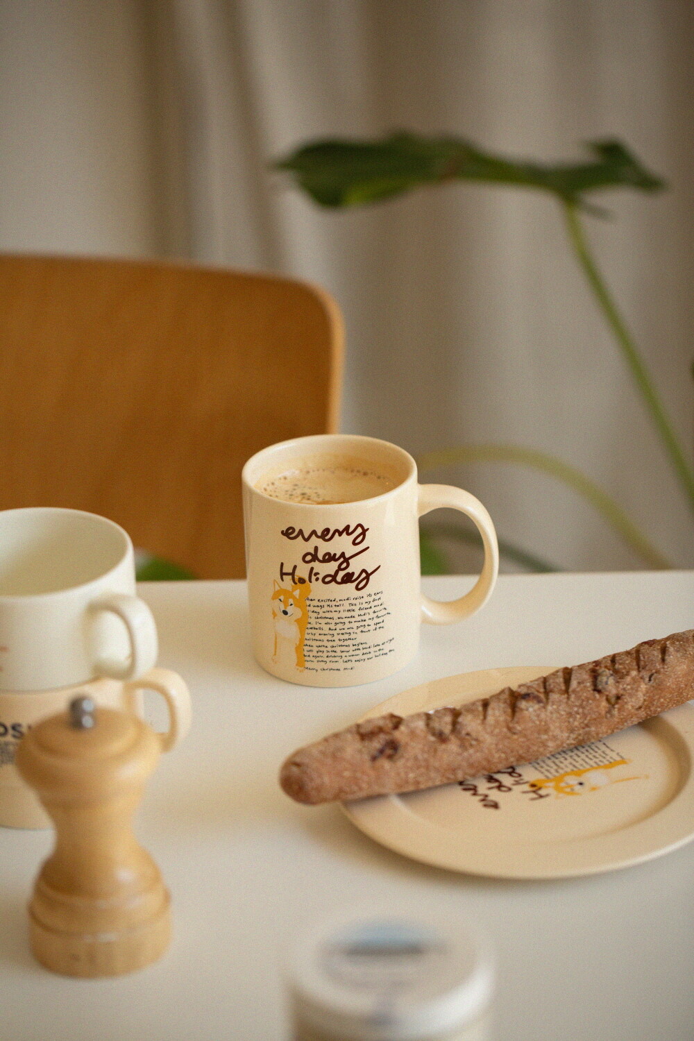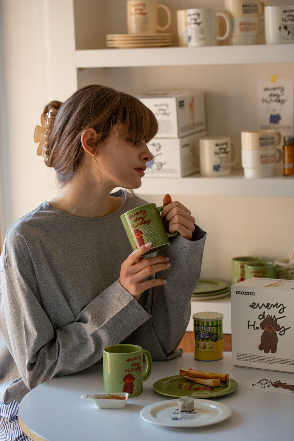 모머위켄드 홀리데이 메인 테마인 ‘에브리데이 홀리데이’ 레터링과 귀여운 강아지 그림이 들어간 도자기 제품입니다.