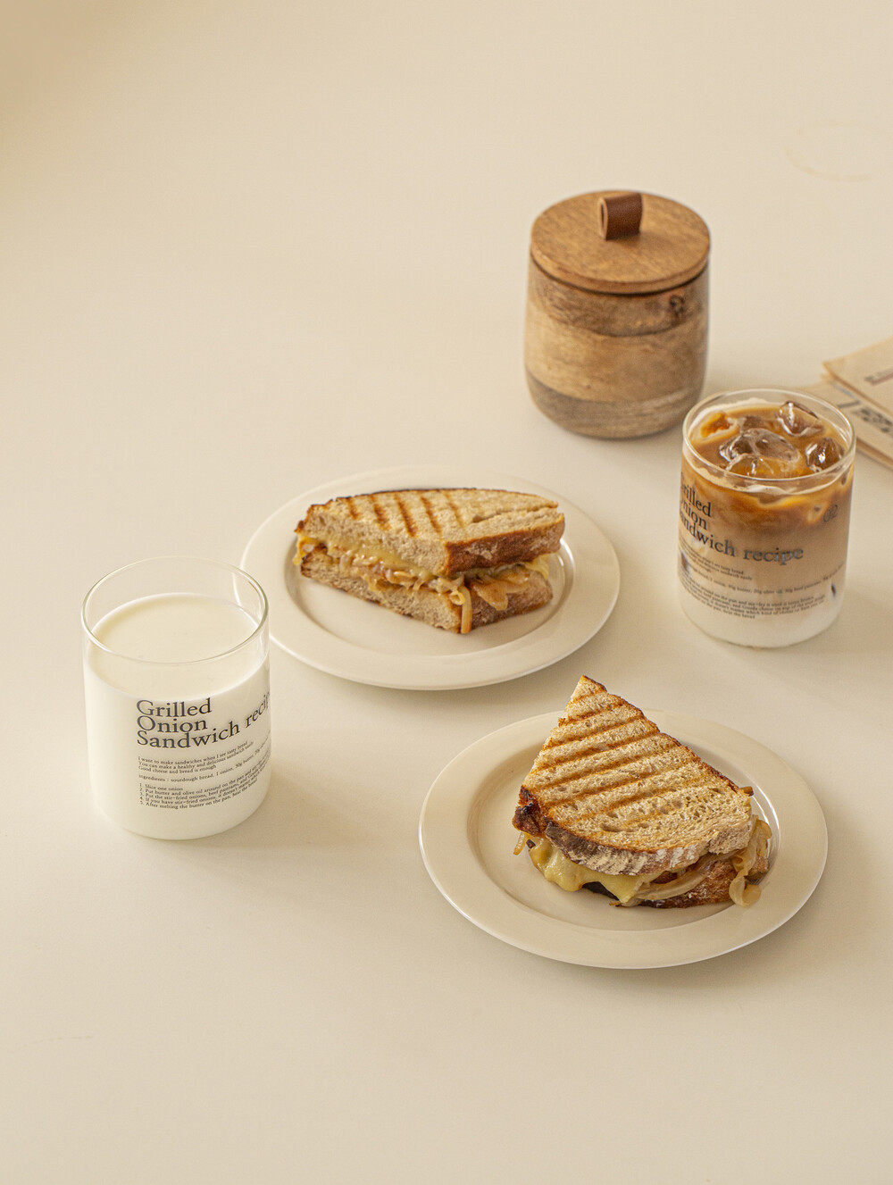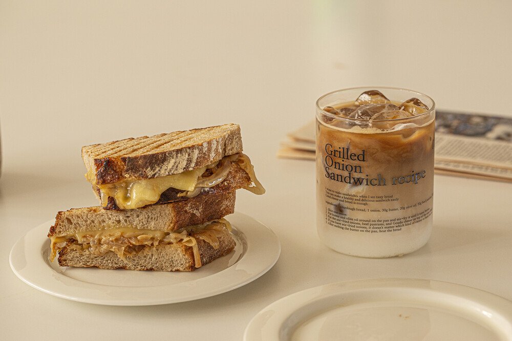 그릴드어니언 샌드위치의 영문 레시피가 인쇄되어 있는 유리컵입니다.